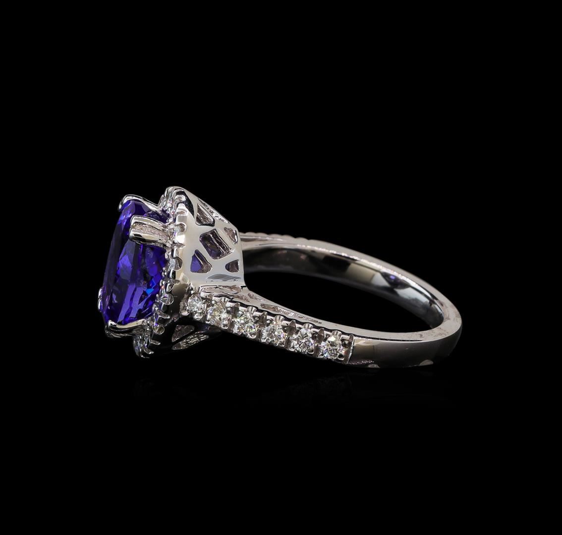 One electronically tested 14KT white gold lady's cast fashion ring with a basket halo with a bright polish finish. The featured lady's ring has a shank measuring 2.35 millimeters wide. Identified with markings of '14K'. Condition is new, good workmanship. Containing: One prong set oval modified brilliant cut natural tanzanite, measuring 10.34 x 8.15 x 5.79mm, (depth est.) approximate weight of 3.55ct., clarity is eye clean, medium dark, moderately strong, violetish blue color, (GIA vB 6/4), cut is very good. Transmitting light with no distortion, transparent. Colored gemstones are presumed to have been subjected to commonly used enhancement processes. Graded in the setting. Twelve prong set round brilliant cut diamonds, measuring 1.90 - 1.85 x 1.13mm (depth est.) approximate total weight of 12 Stones = 0.29ct. Graded in the setting. Clarity SI-1 to I-1. Color: H - I Cut Good Fourteen prong set round brilliant cut diamonds, measuring 1.70 - 1.60 x 1.02mm (depth est.) approximate total weight of 14 Stones = 0.24ct. Graded in the setting. Clarity SI-1 to SI-2. Color: G - I Cut Good. Total Weight of Colored Stones 3.55ct. Total Weight of Diamonds 0.53ct. Total Weight of Ring 6.70gm. GAS Appraised at $8,455.00.