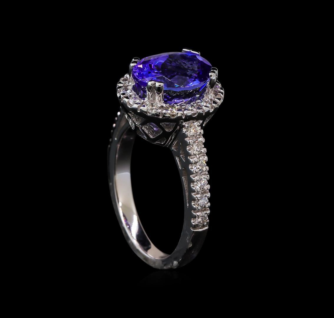 One electronically tested 14KT white gold lady's cast fashion ring with a basket halo with a bright polish finish. The featured lady's ring has a shank measuring 2.35 millimeters wide. Identified with markings of '14K'. Condition is new, good workmanship. Containing: One prong set oval modified brilliant cut natural tanzanite, measuring 10.34 x 8.15 x 5.79mm, (depth est.) approximate weight of 3.55ct., clarity is eye clean, medium dark, moderately strong, violetish blue color, (GIA vB 6/4), cut is very good. Transmitting light with no distortion, transparent. Colored gemstones are presumed to have been subjected to commonly used enhancement processes. Graded in the setting. Twelve prong set round brilliant cut diamonds, measuring 1.90 - 1.85 x 1.13mm (depth est.) approximate total weight of 12 Stones = 0.29ct. Graded in the setting. Clarity SI-1 to I-1. Color: H - I Cut Good Fourteen prong set round brilliant cut diamonds, measuring 1.70 - 1.60 x 1.02mm (depth est.) approximate total weight of 14 Stones = 0.24ct. Graded in the setting. Clarity SI-1 to SI-2. Color: G - I Cut Good. Total Weight of Colored Stones 3.55ct. Total Weight of Diamonds 0.53ct. Total Weight of Ring 6.70gm. GAS Appraised at $8,455.00.