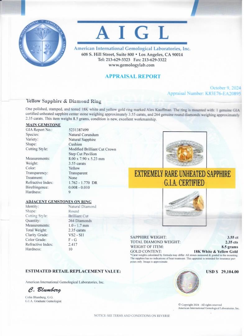 One polished, stamped, and tested 18K white and yellow gold ring marked Alex Kauffman. The ring is mounted with: 1 genuine GIA certified unheated sapphire center stone weighing approximately 3.55 carats, and 264 genuine round diamonds weighing approximately 2.35 carats. This item weighs 8.5 grams, condition is new, excellent workmanship. #MAIN GEMSTONE# GIA Report No.: 5231387499 Species: Natural Corundum Variety: Natural Sapphire Shape: Cushion Cutting Style: Modified Brilliant Cut Crown, Step Cut Pavilion Measurements: 8.00 x 7.90 x 5.23mm Weight: 3.55 carats Color: Yellow Transparency: Transparent Treatment: None Refractive Index: 1.762 - 1.770 DR Birefringence: 0.008 - 0.010 Hardness: 9 #ADJACENT GEMSTONES ON RING# Identity: Natural Diamond Shape: Round Cutting Style: Brilliant Cut Quantity: 264 Diamonds Measurements: 1.0 - 1.7mm Total Weight: 2.35 carats Clarity Grade: VS2-SI1 Color Grade: F-G Refractive Index: 2.417 Hardness: 10 SAPPHIRE WEIGHT: 3.55 ct TOTAL DIAMOND WEIGHT: 2.35 cts WEIGHT OF ITEM: 8.5 grams GOLD CONTENT: 18K White & Yellow Gold Size: 7