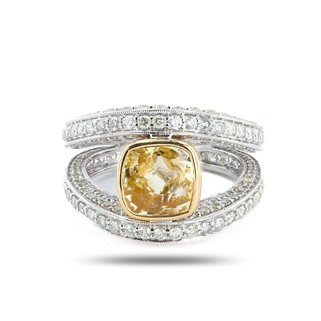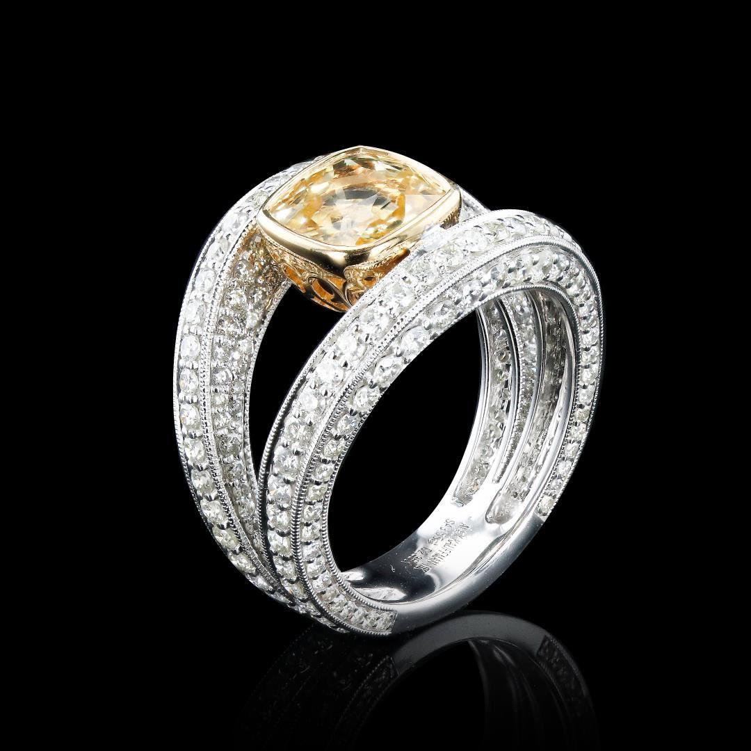 One polished, stamped, and tested 18K white and yellow gold ring marked Alex Kauffman. The ring is mounted with: 1 genuine GIA certified unheated sapphire center stone weighing approximately 3.55 carats, and 264 genuine round diamonds weighing approximately 2.35 carats. This item weighs 8.5 grams, condition is new, excellent workmanship. #MAIN GEMSTONE# GIA Report No.: 5231387499; Species: Natural Corundum; Variety: Natural Sapphire; Shape: Cushion; Cutting Style: Modified Brilliant Cut Crown, Step Cut Pavilion; Measurements: 8.00 x 7.90 x 5.23mm; Weight: 3.55 carats; Color: Yellow; Transparency: Transparent; Treatment: None; Refractive Index: 1.762 - 1.770 DR; Birefringence: 0.008 - 0.010; Hardness: 9 #ADJACENT GEMSTONES ON RING# Identity: Natural Diamond; Shape: Round; Cutting Style: Brilliant Cut; Quantity: 264 Diamonds; Measurements: 1.0 - 1.7mm; Total Weight: 2.35 carats; Clarity Grade: VS2-SI1; Color Grade: F-G; Refractive Index: 2.417; Hardness: 10; SAPPHIRE WEIGHT: 3.55 ct; TOTAL DIAMOND WEIGHT: 2.35 cts; WEIGHT OF ITEM: 8.5 grams; GOLD CONTENT: 18K White & Yellow Gold #Size: 7