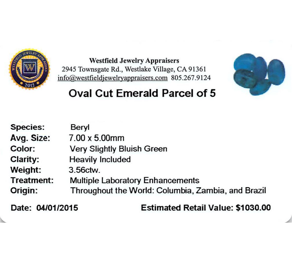 Five oval mixed cut natural emeralds exact total weight 3.56ct., clarity is moderately included, type III, medium dark, very slightly grayish, very slightly bluish green color, (GIA vslbG 6/3), cut is good. Westfield Appraised at $1,030.00.