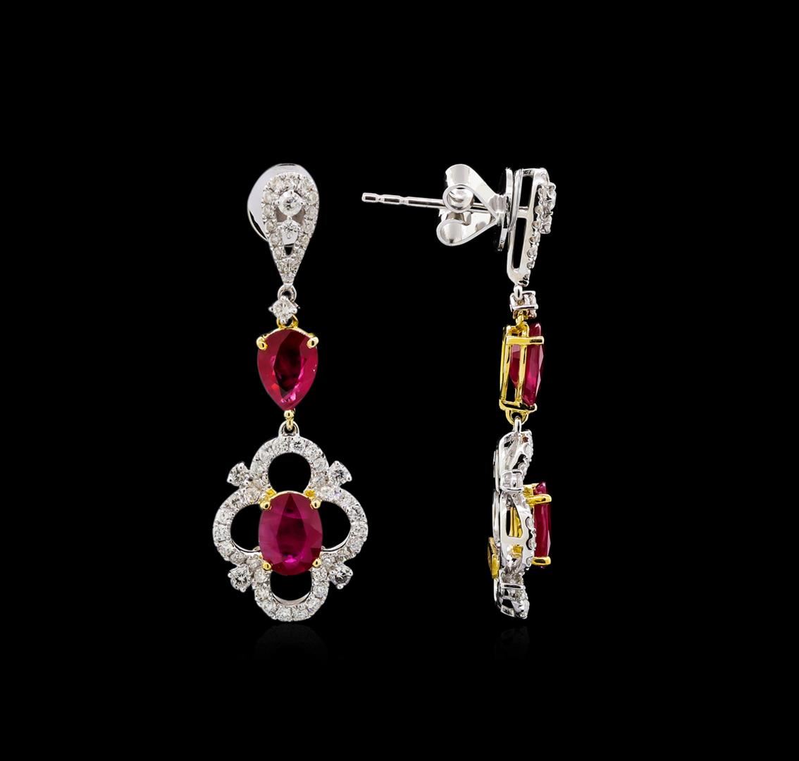 One pair electronically tested 18KT white and yellow gold lady's combination cast & assembled fashion earrings with friction posts with a bright polish finish. Identified with markings of "750". Condition is new, good workmanship. Containing: Two prong set oval modified brilliant cut natural rubies, measuring 7.20 x 5.24 x 3.30mm, approximate total weight of 2.10ct., clarity is heavily included, type II, dark, moderately strong, red color, (GIA R 7/4), cut is good. Colored gemstones are presumed to have been subjected to commonly used enhancement processes. Graded in the setting. Two prong set pear modified brilliant cut natural rubies, measuring 7.00 x 4.95 x 2.65mm, approximate total weight of 1.46ct., clarity is moderately included, type II, medium dark, moderately strong, red color, (GIA R 6/4), cut is good. Colored gemstones are presumed to have been subjected to commonly used enhancement processes. Graded in the setting. Twelve prong set round brilliant cut diamonds, measuring 1.60 - 1.50 x 0.98mm (depth est.) approximate total weight of 12 Stones = 0.17ct. Graded in the setting. Clarity: VS-2 to SI-1. Color: G - Good Forty-Seven prong set round brilliant cut diamonds, measuring 1.30 - 1.25 x 0.81mm (depth est.) approximate total weight of 47 Stones = 0.40ct. Graded in the setting. Clarity: VS-2 to SI-1. Color: G - Good. Total Weight of Colored Stones 3.56ct. Total Weight of Diamonds 0.57ct. Total Weight of Earrings 6.60gm. GAS Appraised at $7,805.00.