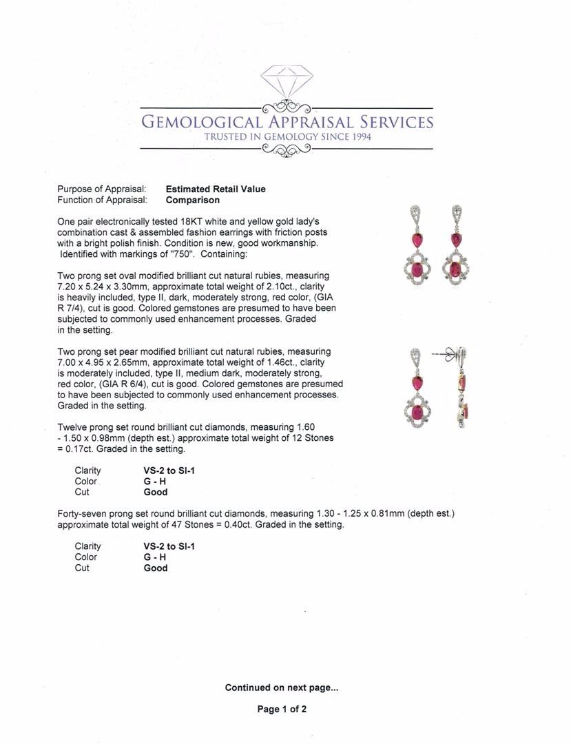 One pair electronically tested 18KT white and yellow gold lady's combination cast & assembled fashion earrings with friction posts with a bright polish finish. Identified with markings of "750". Condition is new, good workmanship. Containing: Two prong set oval modified brilliant cut natural rubies, measuring 7.20 x 5.24 x 3.30mm, approximate total weight of 2.10ct., clarity is heavily included, type II, dark, moderately strong, red color, (GIA R 7/4), cut is good. Colored gemstones are presumed to have been subjected to commonly used enhancement processes. Graded in the setting. Two prong set pear modified brilliant cut natural rubies, measuring 7.00 x 4.95 x 2.65mm, approximate total weight of 1.46ct., clarity is moderately included, type II, medium dark, moderately strong, red color, (GIA R 6/4), cut is good. Colored gemstones are presumed to have been subjected to commonly used enhancement processes. Graded in the setting. Twelve prong set round brilliant cut diamonds, measuring 1.60 - 1.50 x 0.98mm (depth est.) approximate total weight of 12 Stones = 0.17ct. Graded in the setting. Clarity: VS-2 to SI-1. Color: G - Good Forty-Seven prong set round brilliant cut diamonds, measuring 1.30 - 1.25 x 0.81mm (depth est.) approximate total weight of 47 Stones = 0.40ct. Graded in the setting. Clarity: VS-2 to SI-1. Color: G - Good. Total Weight of Colored Stones 3.56ct. Total Weight of Diamonds 0.57ct. Total Weight of Earrings 6.60gm. GAS Appraised at $7,805.00.