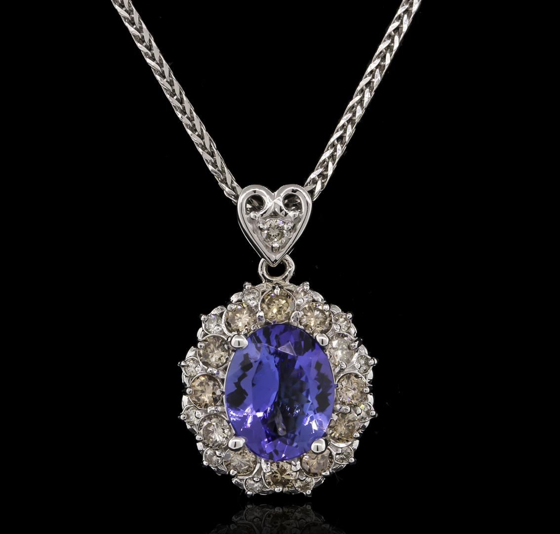 One electronically tested 14KT white gold ladies cast tanzanite and diamond pendant & chain 16.0" long, with a lobster claw clasp with a bright polish finish. Identified with markings of "14K". Condition is new. Containing: One prong set oval modified brilliant cut natural tanzanite, measuring 10.62 x 8.56 x 5.56mm, approximate weight of 3.56ct., clarity is eye clean, type I, medium, very slightly grayish, bluish violet color, (GIA bV 5/3), cut is good. Twelve prong set round brilliant cut diamonds, measuring 2.50 - 2.50 x 1.50mm (depth est.) approximate. Total Weight of 12 Stones = 0.69ct. Clarity: SI-2 to I-1, Cut is Good. Twelve prong set round brilliant cut diamonds, measuring 1.30 - 1.30 x 0.78mm (depth est.) approximate. Total Weight of 12 Stones = 0.10ct. Clarity: I-1 to I-2. Color: I - J, Cut is Good. Colored gemstones are presumed to have been subjected to commonly used enhancement processes. All diamonds and colored gemstones are graded in the mounting, unless otherwise stated. Total Weight of Colored Stones 3.56ct. Total Weight of Diamonds 0.78ct. Total Weight of Pendant & Chain 7.60 grams. GGL Appraised at $4,610.00.