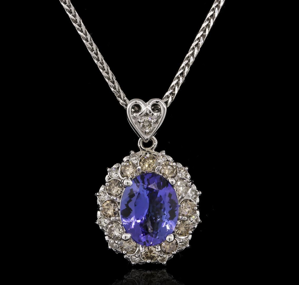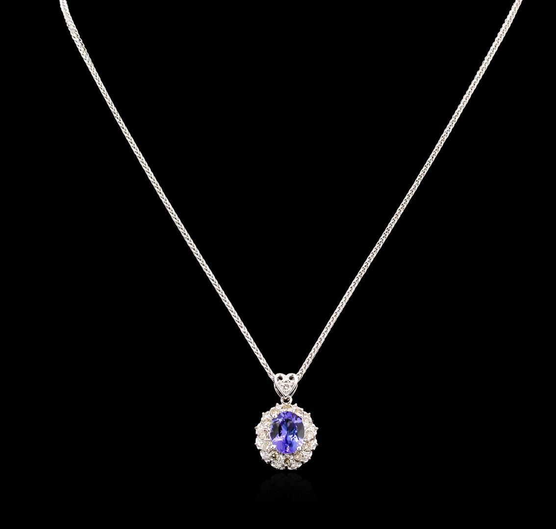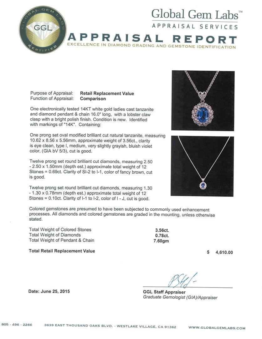 One electronically tested 14KT white gold ladies cast tanzanite and diamond pendant & chain 16.0" long, with a lobster claw clasp with a bright polish finish. Identified with markings of "14K". Condition is new. Containing: One prong set oval modified brilliant cut natural tanzanite, measuring 10.62 x 8.56 x 5.56mm, approximate weight of 3.56ct., clarity is eye clean, type I, medium, very slightly grayish, bluish violet color, (GIA bV 5/3), cut is good. Twelve prong set round brilliant cut diamonds, measuring 2.50 - 2.50 x 1.50mm (depth est.) approximate. Total Weight of 12 Stones = 0.69ct. Clarity: SI-2 to I-1, Cut is Good. Twelve prong set round brilliant cut diamonds, measuring 1.30 - 1.30 x 0.78mm (depth est.) approximate. Total Weight of 12 Stones = 0.10ct. Clarity: I-1 to I-2. Color: I - J, Cut is Good. Colored gemstones are presumed to have been subjected to commonly used enhancement processes. All diamonds and colored gemstones are graded in the mounting, unless otherwise stated. Total Weight of Colored Stones 3.56ct. Total Weight of Diamonds 0.78ct. Total Weight of Pendant & Chain 7.60 grams. GGL Appraised.