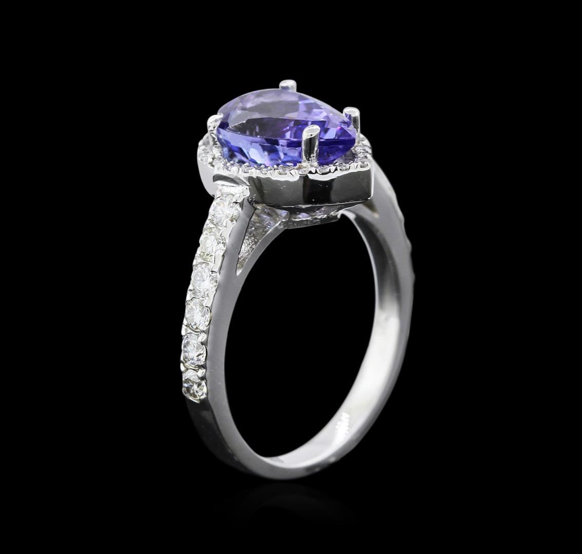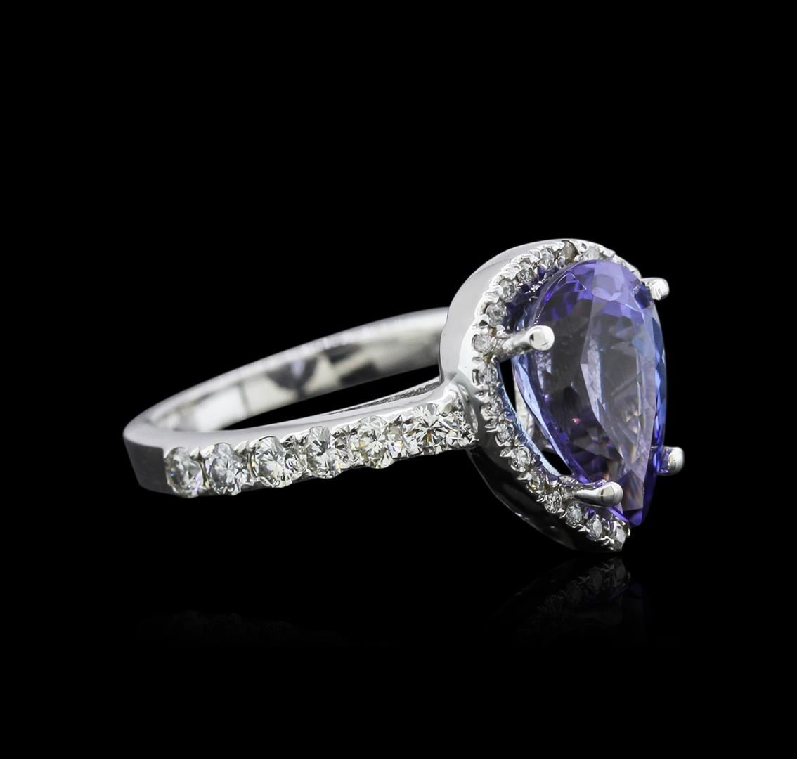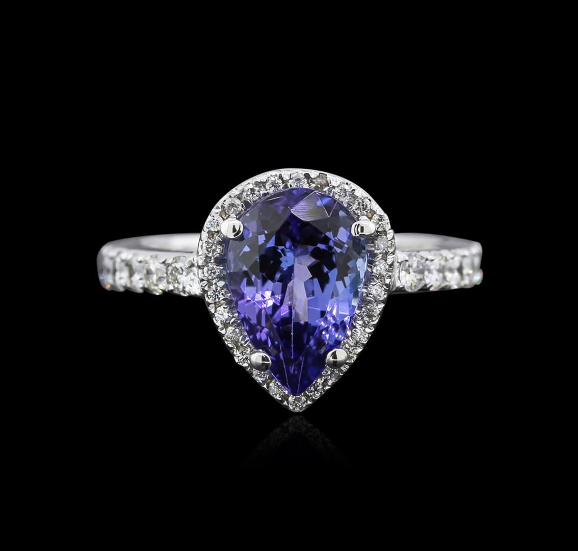 One electronically tested 14KT white gold ladies cast tanzanite and diamond ring with a bright polish finish. The featured tanzanite is set within a diamond bezel supported by diamond set shoulders, completed by a two millimeter wide band. Identified with markings of "14K". Condition is new, good workmanship. Containing: One prong set pear mixed cut natural tanzanite approximate weight of 3.56ct., clarity is eye clean, type I, medium dark, very slightly grayish, bluish violet color, (GIA bV 6/3), cut is good. Transmitting light with no distortion, transparent. Graded in the setting. Tanzanite is a very rare gemstone that is only found in the country of Tanzania. Originally discovered in 1967. Tiffany & Company, named the stone Tanzanite. It is found in the Usumburu Mountains that border the Umba Valley of northern Tanzania. Tanzanite occurs in gray, brown, violet, blue, reddish-purple, & green. The gem is interesting because of its exceptional pleochroism. Rotated in different directions a tanzanite will exhibit multiple changes of color. Tanzanite has a low tolerance to ultrasonic cleaning, and should not be cleaned using this method. Thirty-Eight prong set round brilliant cut diamonds approximate total weight of 38 Stones = 0.70ct. Graded in the setting. Clarity SI-2 to I-1 Color H - J. Total Weight of Colored Stones 3.56ct. Total Weight of Diamonds 0.70ct. Total Weight of Ring 6.35 grams. AIG Appraised at $10,955.00.