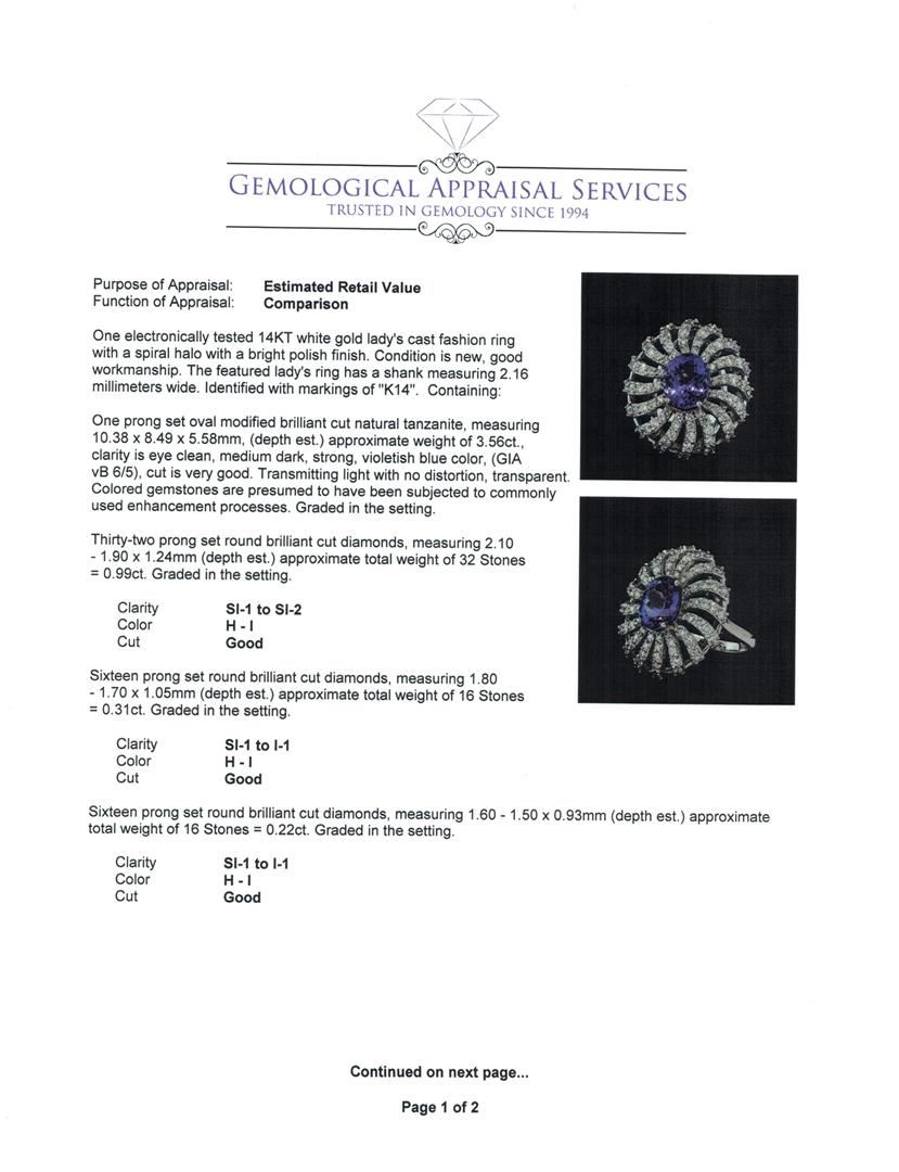 One electronically tested 14KT white gold lady's cast fashion ring with a spiral halo with a bright polish finish. The featured lady's ring has a shank measuring 2.16 millimeters wide. Identified with markings of 'K14'. Condition is new, good workmanship. Containing: One prong set oval modified brilliant cut natural tanzanite, measuring 10.38 x 8.49 x 5.58mm, (depth est.) approximate weight of 3.56ct., clarity is eye clean, medium dark, strong, violetish blue color, (GIA vB 6/5), cut is very good. Transmitting light with no distortion, transparent. Colored gemstones are presumed to have been subjected to commonly used enhancement processes. Graded in the setting. Thirty-Two prong set round brilliant cut diamonds, measuring 2.10 - 1.90 x 1.24mm (depth est.) approximate total weight of 32 Stones = 0.99ct. Graded in the setting. Clarity SI-1 to SI-2. Color: H - I Cut Good Sixteen prong set round brilliant cut diamonds, measuring 1.80 - 1.70 x 1.05mm (depth est.) approximate total weight of 16 Stones = 0.31ct. Graded in the setting. Clarity SI-1 to I-1. Color: H - I Cut Good Sixteen prong set round brilliant cut diamonds, measuring 1.60 - 1.50 x 0.93mm (depth est.) approximate total weight of 16 Stones = 0.22ct. Graded in the setting. Clarity SI-1 to I-1. Color: H - I Cut Good Sixteen prong set round brilliant cut diamonds, measuring 1.40 - 1.35 x 0.86mm (depth est.) approximate total weight of 16 Stones = 0.16ct. Graded in the setting. Clarity SI-1 to SI-2. Color: H - I Cut Good. Total Weight of Colored Stones 3.56ct.. Total Weight of Diamonds 1.68ct.. Total Weight of Ring 9.60gm. GAS Appraised at $11,720.00.