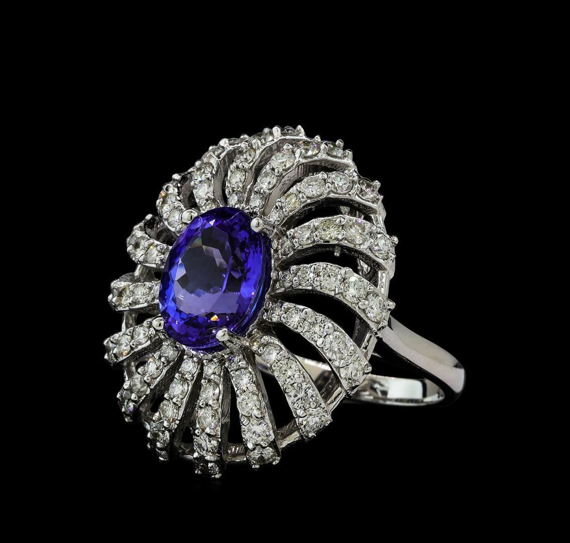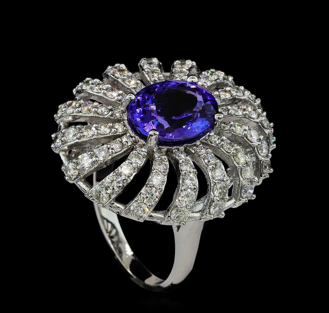 One electronically tested 14KT white gold lady's cast fashion ring with a spiral halo with a bright polish finish. The featured lady's ring has a shank measuring 2.16 millimeters wide. Identified with markings of 'K14'. Condition is new, good workmanship. Containing: One prong set oval modified brilliant cut natural tanzanite, measuring 10.38 x 8.49 x 5.58mm, (depth est.) approximate weight of 3.56ct., clarity is eye clean, medium dark, strong, violetish blue color, (GIA vB 6/5), cut is very good. Transmitting light with no distortion, transparent. Colored gemstones are presumed to have been subjected to commonly used enhancement processes. Graded in the setting. Thirty-Two prong set round brilliant cut diamonds, measuring 2.10 - 1.90 x 1.24mm (depth est.) approximate total weight of 32 Stones = 0.99ct. Graded in the setting. Clarity SI-1 to SI-2. Color: H - I Cut Good Sixteen prong set round brilliant cut diamonds, measuring 1.80 - 1.70 x 1.05mm (depth est.) approximate total weight of 16 Stones = 0.31ct. Graded in the setting. Clarity SI-1 to I-1. Color: H - I Cut Good Sixteen prong set round brilliant cut diamonds, measuring 1.60 - 1.50 x 0.93mm (depth est.) approximate total weight of 16 Stones = 0.22ct. Graded in the setting. Clarity SI-1 to I-1. Color: H - I Cut Good Sixteen prong set round brilliant cut diamonds, measuring 1.40 - 1.35 x 0.86mm (depth est.) approximate total weight of 16 Stones = 0.16ct. Graded in the setting. Clarity SI-1 to SI-2. Color: H - I Cut Good. Total Weight of Colored Stones 3.56ct.. Total Weight of Diamonds 1.68ct.. Total Weight of Ring 9.60gm. GAS Appraised.