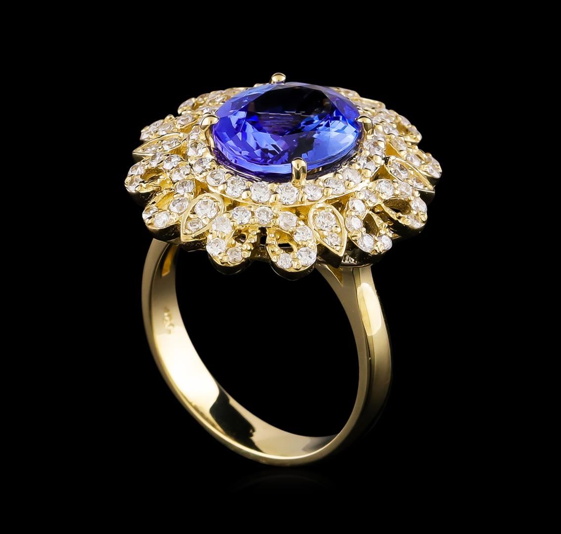 One electronically tested 14KT yellow gold lady's cast fashion ring with a basket scalloped halo with a bright polish finish. The featured lady's ring has a shank measuring 3.62 millimeters in width. Identified with markings of "K14". Condition is new, good workmanship. Containing: One prong set oval oval modified brilliant cut natural tanzanite, measuring 11.25 x 9.00 x 4.77mm, (depth est.) approximate weight of 3.56ct., clarity is eye clean, medium, moderately strong, violetish blue color, (GIA vB 5/4), cut is very good. Transmitting light with no distortion, transparent. Colored gemstones are presumed to have been subjected to commonly used enhancement processes. Graded in the setting. Twenty-Eight prong set round brilliant cut diamonds, measuring 1.60 - 1.50 x 0.95mm (depth est.) approximate total weight of 28 Stones = 0.38ct. Graded in the setting. Clarity: SI-1 to SI-2. Color: H - I. Cut Good Fifty-Four prong set round brilliant cut diamonds, measuring 1.40 - 1.30 x 0.84mm (depth est.) approximate total weight of 54 Stones = 0.52ct. Graded in the setting. Clarity: SI-1 to I-1. Color: H - I. Cut Good Six prong set round brilliant cut diamonds, measuring 1.20 - 1.10 x 0.71mm (depth est.) approximate total weight of 6 Stones = 0.04ct. Graded in the setting. Clarity: SI-2 to I-1. Color: H - I. Cut Good. Total Weight of Colored Stones 3.56ct. Total Weight of Diamonds 0.94ct. Total Weight of Ring 8.10gm. GAS Appraised at $9,515.00.