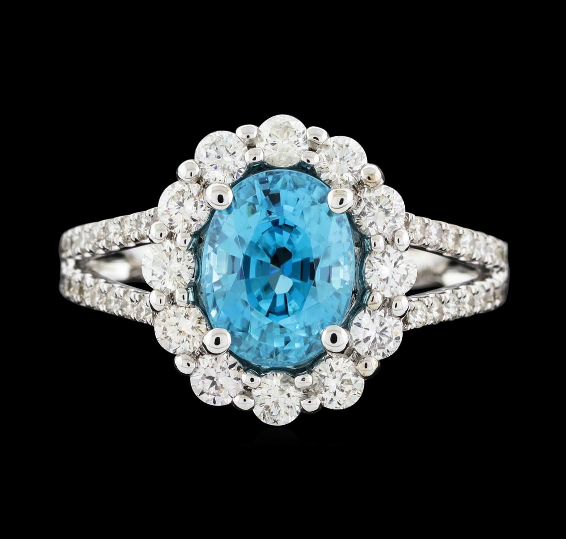 One electronically tested 14KT white gold lady's cast fashion ring with a split shank basket halo with a bright polish finish. The featured lady's ring has a shank measuring 2.00 millimeters wide. Identified with markings of '14K'. Condition is new, good workmanship. Containing: One prong set oval modified mixed cut natural blue zircon, measuring 8.93 x 6.94 x 5.70mm, (depth est.) approximate weight of 3.56ct., clarity is eye clean, medium, moderately strong, very strongly greenish blue color, (GIA vstgB 5/4), cut is very good. Transmitting light with no distortion, transparent. Colored gemstones are presumed to have been subjected to commonly used enhancement processes. Graded in the setting. Twelve prong set round brilliant cut diamonds, measuring 2.50 - 2.40 x 1.52mm (depth est.) approximate total weight of 12 Stones = 0.68ct. Graded in the setting. Clarity SI-1 to SI-2. Color: G - I Cut Good Thirty-Six prong set round brilliant cut diamonds, measuring 1.30 - 1.25 x 0.79mm (depth est.) approximate total weight of 36 Stones = 0.29ct. Graded in the setting. Clarity SI-1 to SI-2. Color: G - I Cut Good. Total Weight of Colored Stones 3.56ct.. Total Weight of Diamonds 0.97ct.. Total Weight of Ring 4.90gm. GAS Appraised at $5,810.00.
