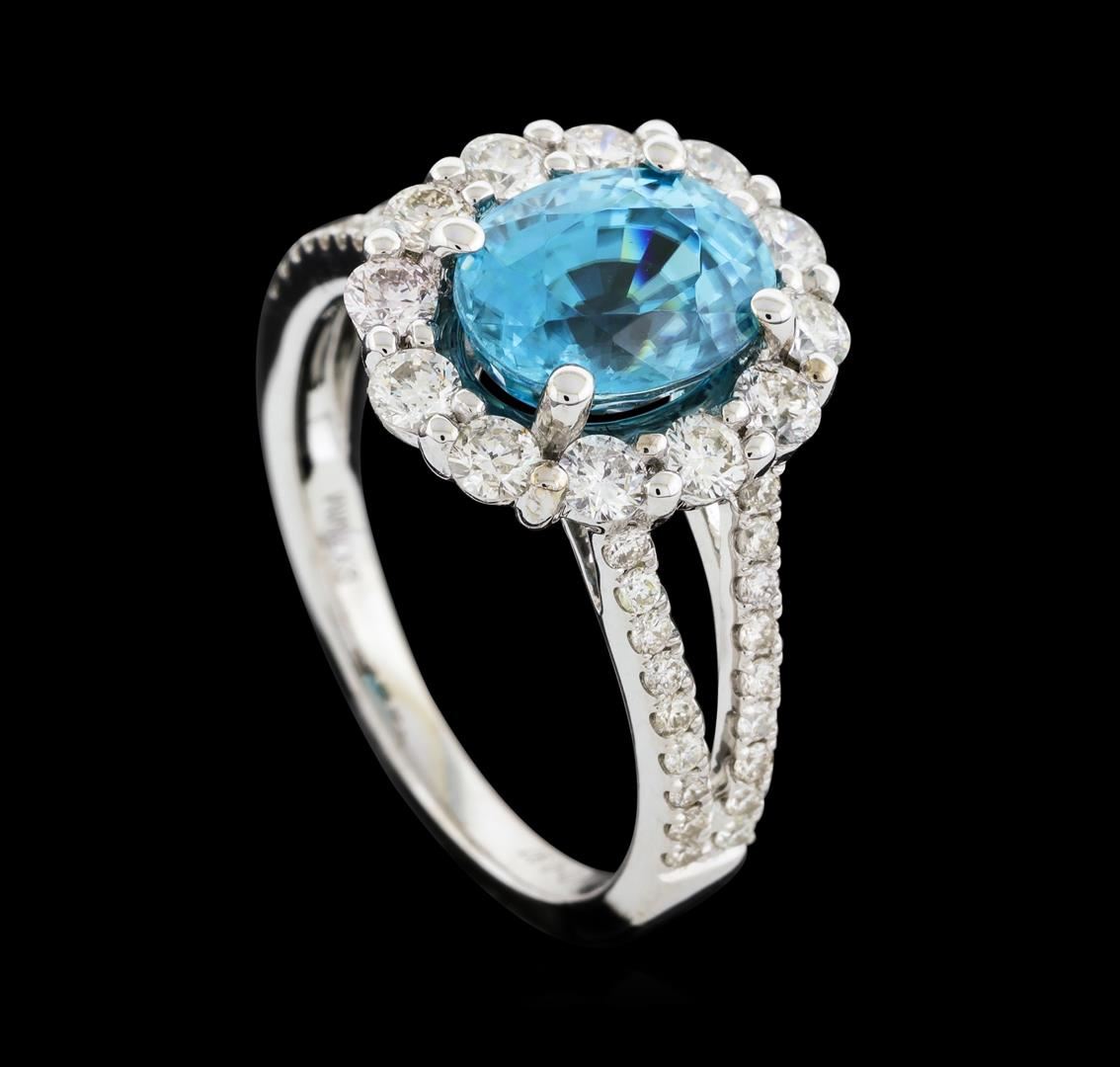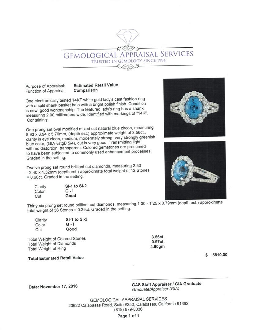One electronically tested 14KT white gold lady's cast fashion ring with a split shank basket halo with a bright polish finish. The featured lady's ring has a shank measuring 2.00 millimeters wide. Identified with markings of '14K'. Condition is new, good workmanship. Containing: One prong set oval modified mixed cut natural blue zircon, measuring 8.93 x 6.94 x 5.70mm, (depth est.) approximate weight of 3.56ct., clarity is eye clean, medium, moderately strong, very strongly greenish blue color, (GIA vstgB 5/4), cut is very good. Transmitting light with no distortion, transparent. Colored gemstones are presumed to have been subjected to commonly used enhancement processes. Graded in the setting. Twelve prong set round brilliant cut diamonds, measuring 2.50 - 2.40 x 1.52mm (depth est.) approximate total weight of 12 Stones = 0.68ct. Graded in the setting. Clarity SI-1 to SI-2. Color: G - I Cut Good Thirty-Six prong set round brilliant cut diamonds, measuring 1.30 - 1.25 x 0.79mm (depth est.) approximate total weight of 36 Stones = 0.29ct. Graded in the setting. Clarity SI-1 to SI-2. Color: G - I Cut Good. Total Weight of Colored Stones 3.56ct.. Total Weight of Diamonds 0.97ct.. Total Weight of Ring 4.90gm. GAS Appraised at $5,810.00.