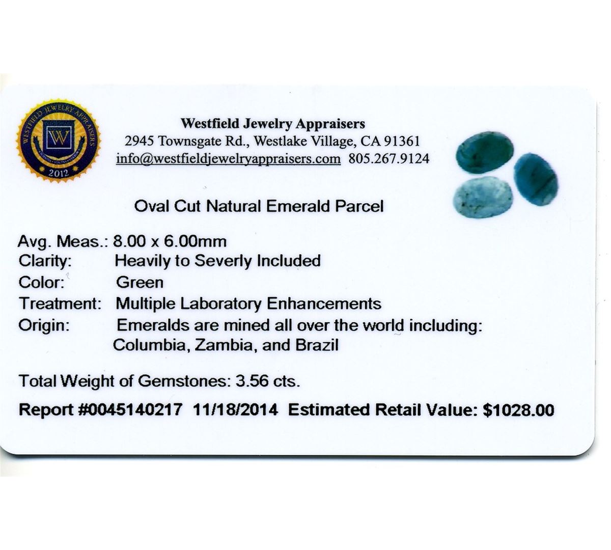 3.56cts. Oval Cut Natural Emerald Parcel Westfield Appraised at $1,028.00.