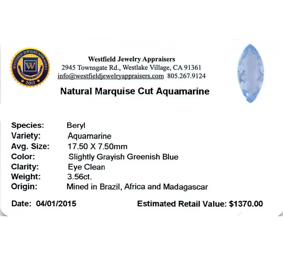 One marquise cut natural aquamarine exact weight 3.56ct., clarity is eye clean, type I, medium, slightly grayish, very slightly greenish blue color, (GIA vslgB 5/2), cut is good. Westfield Appraised at $1,370.00.