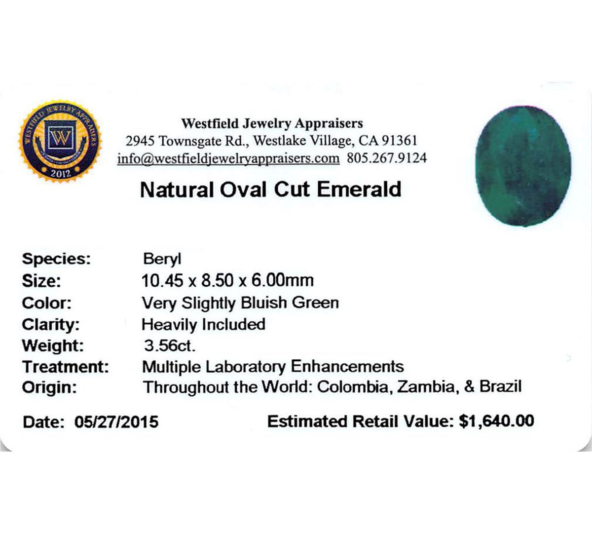 One oval mixed cut natural emerald, measuring 10.45 x 8.50 x 6.00mm, exact weight 3.56ct., clarity is heavily included, type III, medium dark, very slightly grayish, very slightly bluish green color, (GIA vslbG 6/3), cut is good. Transmitting light somewhat diffusely, translucent, Naturally occurring internal & external characteristics are present, Indications of multiple laboratory enhancements, including high temperature heat treatment. Westfield Appraised at $1,640.00.