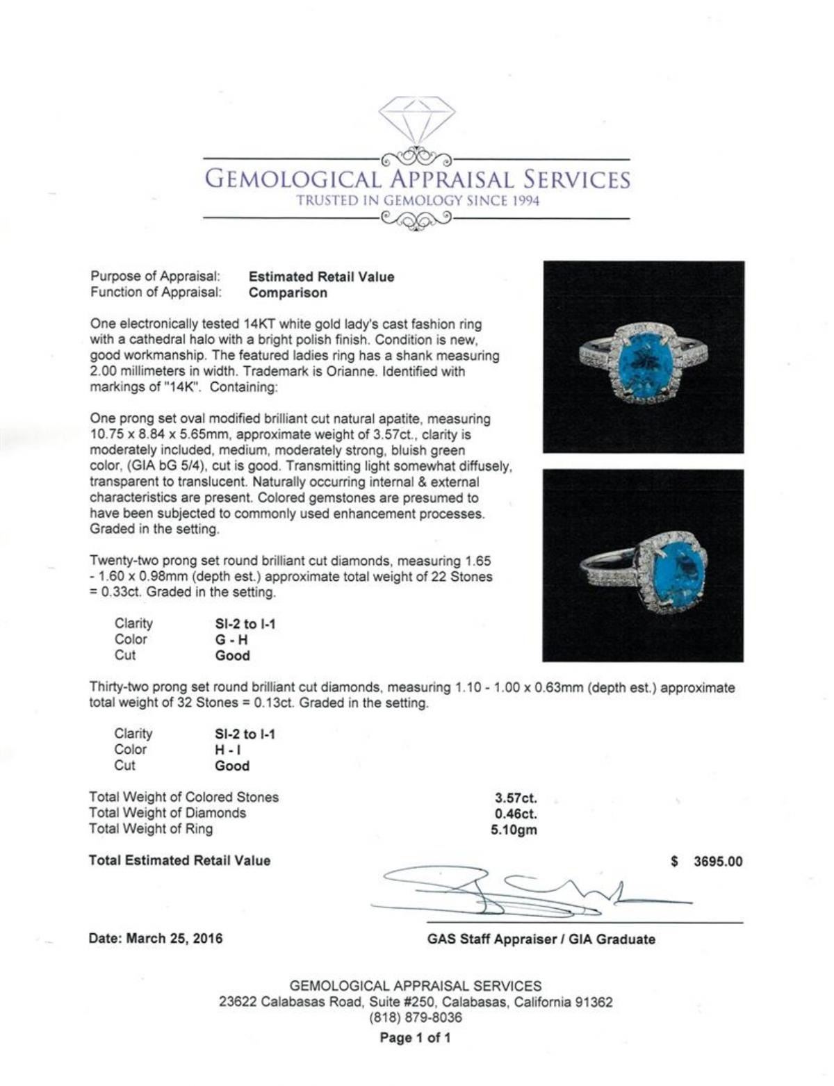 One electronically tested 14KT white gold lady's cast fashion ring with a cathedral halo with a bright polish finish. The featured ladies ring has a shank measuring 2.00 millimeters in width. Trademark is Orianne. Identified with markings of "14K". Condition is new, good workmanship. Containing: One prong set oval modified brilliant cut natural apatite, measuring 10.75 x 8.84 x 5.65mm, approximate weight of 3.57ct., clarity is moderately included, medium, moderately strong, bluish green color, (GIA bG 5/4), cut is good. Transmitting light somewhat diffusely, transparent to translucent. Naturally occurring internal & external characteristics are present. Colored gemstones are presumed to have been subjected to commonly used enhancement processes. Graded in the setting. Twenty-Two prong set round brilliant cut diamonds, measuring 1.65 - 1.60 x 0.98mm (depth est.) approximate total weight of 22 Stones = 0.33ct. Graded in the setting. Clarity: SI-2 to I-1. Color: G - Good Thirty-Two prong set round brilliant cut diamonds, measuring 1.10 - 1.00 x 0.63mm (depth est.) approximate total weight of 32 Stones = 0.13ct. Graded in the setting. Clarity: SI-2 to I-1. Color: H - I. Cut Good. Total Weight of Colored Stones 3.57ct. Total Weight of Diamonds 0.46ct. Total Weight of Ring 5.10gm. GAS Appraised.