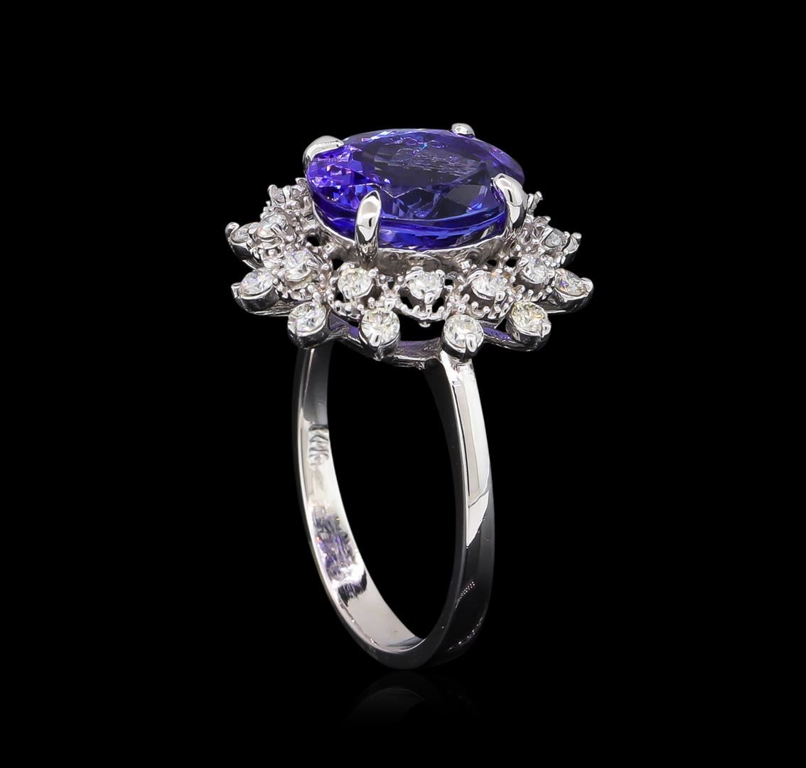One electronically tested 14KT white gold lady's cast fashion ring with a basket double halo with a bright polish with milgrain detailing finish. The featured lady's ring has a shank measuring 2.55 millimeters wide. Identified with markings of "14K". Condition is new, good workmanship. Containing: One prong set oval modified brilliant cut natural tanzanite, measuring 10.77 x 8.33 x 5.74mm, approximate weight of 3.57ct., clarity is eye clean, type I, medium, moderately strong, bluish violet color, (GIA bV 5/4), cut is very good. Transmitting light with no distortion, transparent. Colored gemstones are presumed to have been subjected to commonly used enhancement processes. Graded in the setting. Twelve prong set round brilliant cut diamonds, measuring 1.90 - 1.80 x 1.15mm (depth est.) approximate total weight of 12 Stones = 0.30ct. Graded in the setting. Clarity: SI-1 to SI-2. Color: H - I. Cut Good Twelve prong set round brilliant cut diamonds, measuring 1.70 - 1.60 x 1.01mm (depth est.) approximate total weight of 12 Stones = 0.20ct. Graded in the setting. Clarity: SI-1 to SI-2. Color: H - I. Cut Good. Total Weight of Colored Stones 3.57ct. Total Weight of Diamonds 0.50ct. Total Weight of Ring 4.50gm. GAS Appraised at $7,370.00.