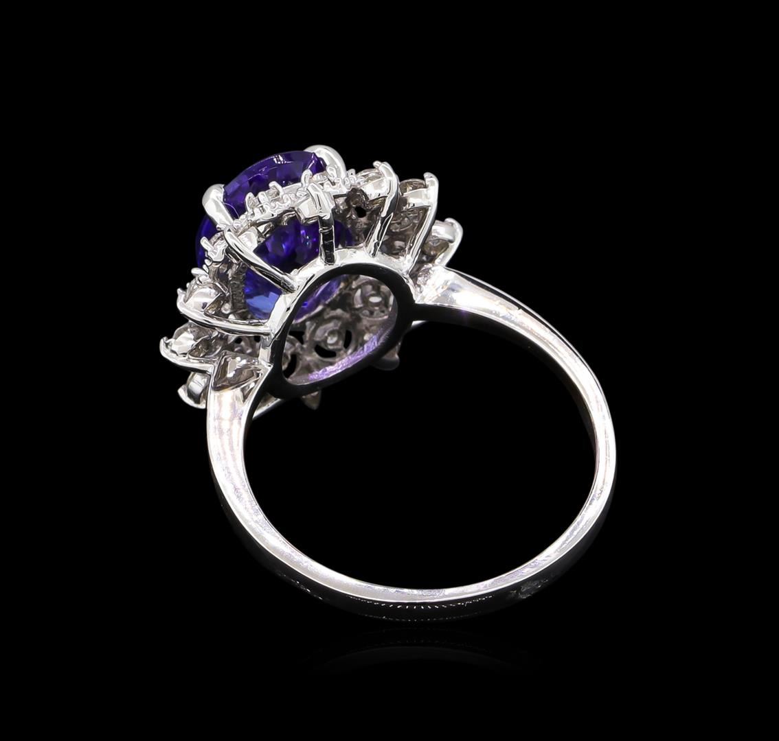 One electronically tested 14KT white gold lady's cast fashion ring with a basket double halo with a bright polish with milgrain detailing finish. The featured lady's ring has a shank measuring 2.55 millimeters wide. Identified with markings of "14K". Condition is new, good workmanship. Containing: One prong set oval modified brilliant cut natural tanzanite, measuring 10.77 x 8.33 x 5.74mm, approximate weight of 3.57ct., clarity is eye clean, type I, medium, moderately strong, bluish violet color, (GIA bV 5/4), cut is very good. Transmitting light with no distortion, transparent. Colored gemstones are presumed to have been subjected to commonly used enhancement processes. Graded in the setting. Twelve prong set round brilliant cut diamonds, measuring 1.90 - 1.80 x 1.15mm (depth est.) approximate total weight of 12 Stones = 0.30ct. Graded in the setting. Clarity: SI-1 to SI-2. Color: H - I. Cut Good Twelve prong set round brilliant cut diamonds, measuring 1.70 - 1.60 x 1.01mm (depth est.) approximate total weight of 12 Stones = 0.20ct. Graded in the setting. Clarity: SI-1 to SI-2. Color: H - I. Cut Good. Total Weight of Colored Stones 3.57ct. Total Weight of Diamonds 0.50ct. Total Weight of Ring 4.50gm. GAS Appraised at $7,370.00.