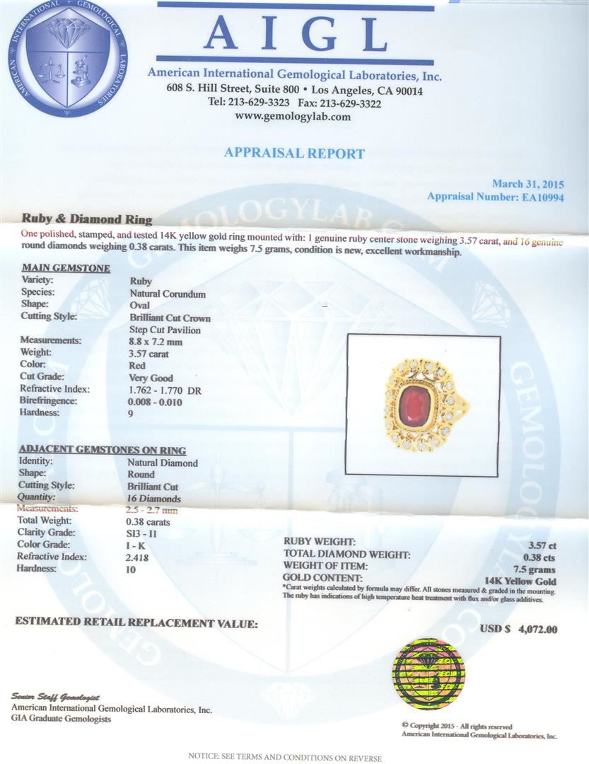 One polished, stamped, and tested 14KT yellow gold ring mounted with: 1 genuine ruby center stone weighing 3.57 carats, and 16 genuine round diamonds weighing 0.38 carats. This item weighs 7.50 grams, condition is new, excellent workmanship. Main Gemstone: Variety: Ruby. Species: Natural corundum. Shape: Oval. Cutting Style: Brilliant cut crown; step cut pavilion. Measurements: 8.8 x 7.2 mm. Weight: 3.57 carat. Color: Red. Cut Grade: Very good. Refractive Index: 1.762 - 1.770 DR. Birefringence: 0.008-0.010. Hardness: 9. Adjacent Gemstones on Ring: Identity: Natural diamond. Shape: Round. Cutting Style: Brilliant cut. Quantity: 16 diamonds. Measurements: 2.5 - 2.7 mm. Total Weight: 0.38 carats. Clarity Grade: SI3-I1. Color Grade: I-K. Refractive Index: 2.418. Hardness: 10. Ruby Weight: 3.57ct. Total Diamond Weight: 0.38ct. Weight of Item: 7.50 grams. Gold Content: 14K Yellow Gold. AIGL Appraised at $4,072.00.