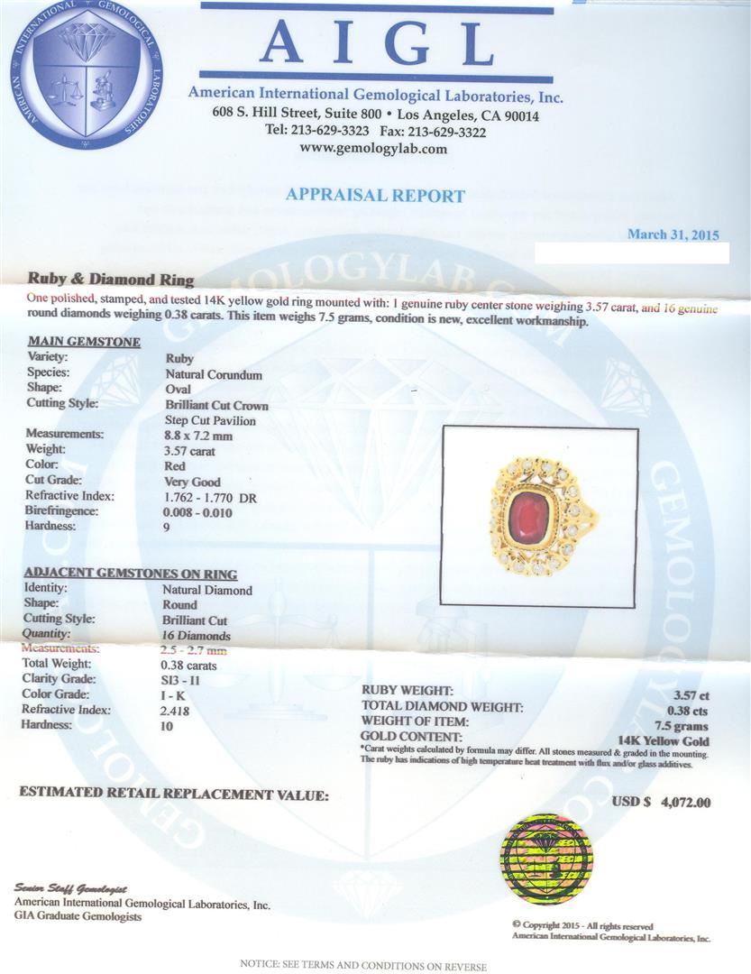 One polished, stamped, and tested 14KT yellow gold ring mounted with: 1 genuine ruby center stone weighing 3.57 carats, and 16 genuine round diamonds weighing 0.38 carats. This item weighs 7.50 grams, condition is new, excellent workmanship. Main Gemstone: Variety: Ruby. Species: Natural corundum. Shape: Oval. Cutting Style: Brilliant cut crown; step cut pavilion. Measurements: 8.8 x 7.2 mm. Weight: 3.57 carat. Color: Red. Cut Grade: Very good. Refractive Index: 1.762 - 1.770 DR. Birefringence: 0.008-0.010. Hardness: 9. Adjacent Gemstones on Ring: Identity: Natural diamond. Shape: Round. Cutting Style: Brilliant cut. Quantity: 16 diamonds. Measurements: 2.5 - 2.7 mm. Total Weight: 0.38 carats. Clarity Grade: SI3-I1. Color Grade: I-K. Refractive Index: 2.418. Hardness: 10. Ruby Weight: 3.57ct. Total Diamond Weight: 0.38ct. Weight of Item: 7.50 grams. Gold Content: 14K Yellow Gold. AIGL Appraised at $4,072.00.