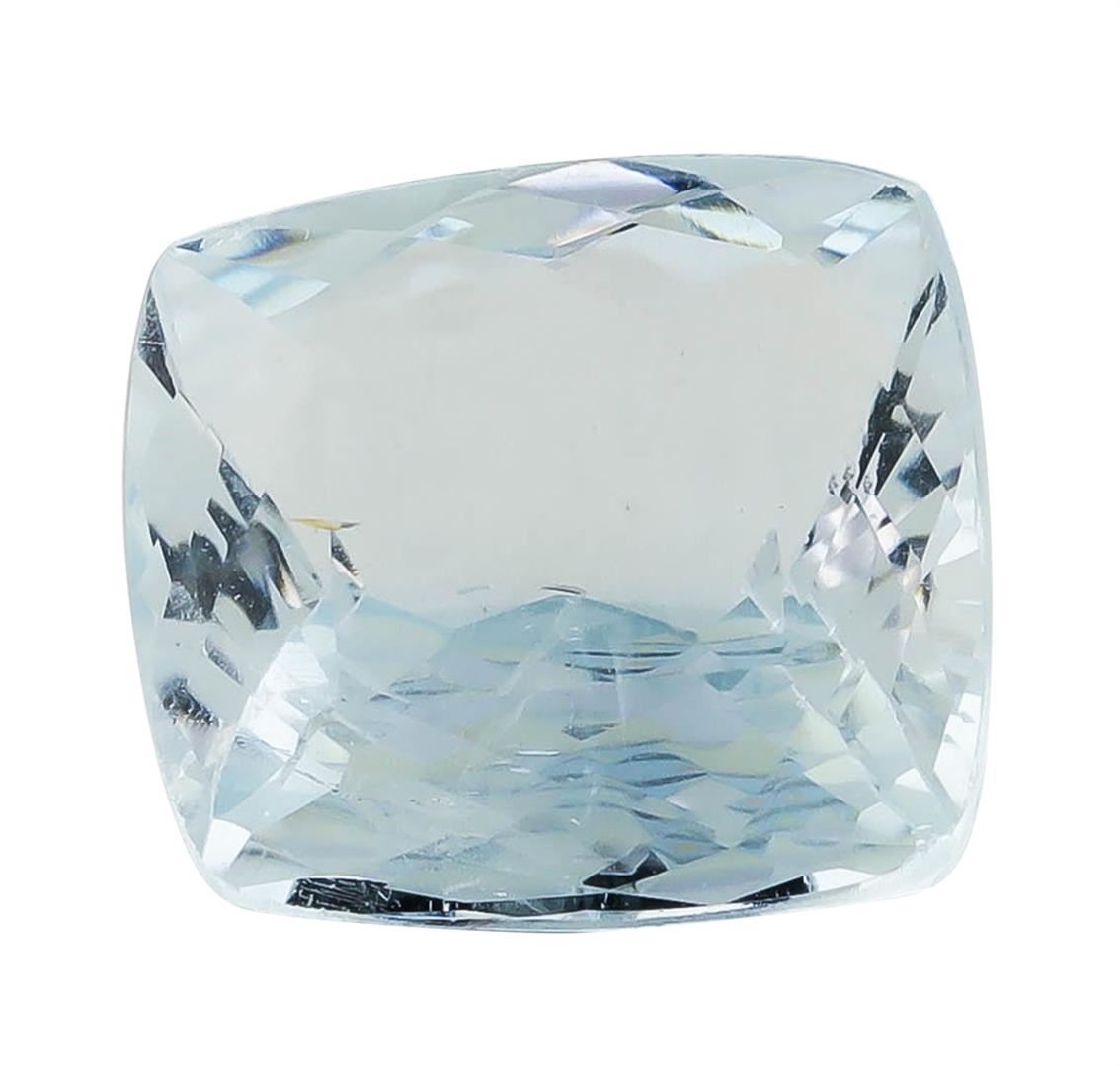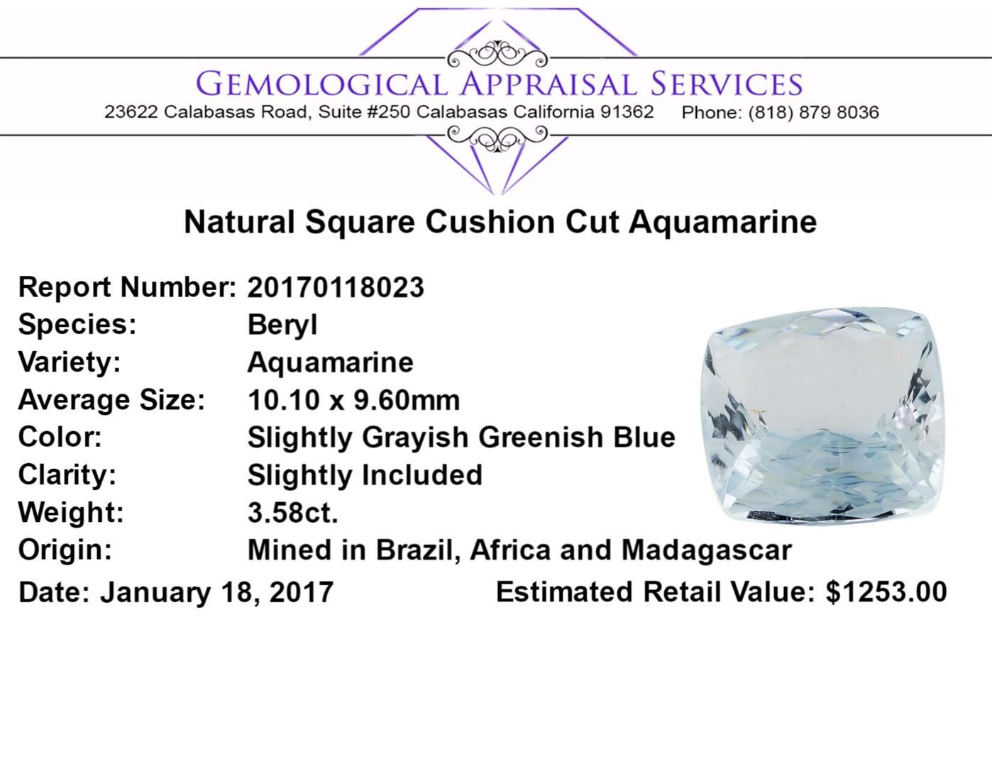 One natural square cushion cut aquamarine with an exact weight of 3.58ct., clarity is slightly included, slightly grayish greenish blue. Gemological Appraisals Services estimates the retail value at $1253 GAS Appraised.