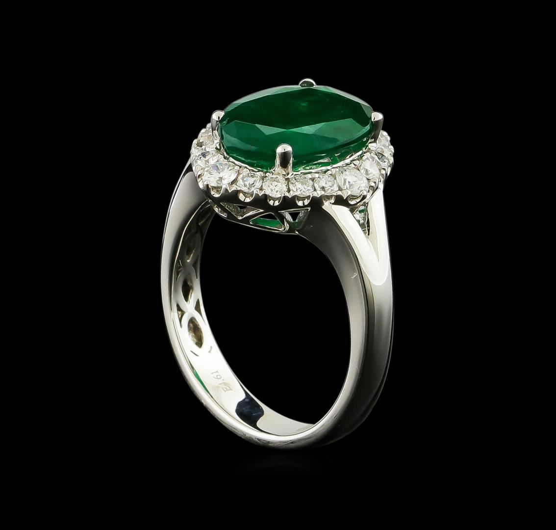 One electronically tested 18KT white gold lady's cast fashion ring with a basket halo with a bright polish finish. The featured lady's ring has a shank measuring 3.78 millimeters wide. Identified with markings of "18K". Condition is new, good workmanship. Containing: One prong set oval modified brilliant cut natural emerald, measuring 12.16 x 9.52 x 4.76mm, 15%. bulge factor, approximate weight of 3.58ct., clarity is moderately included, type III, medium dark, very slightly grayish, green color, (GIA G 6/3), cut is good. Transmitting light somewhat diffusely, transparent to translucent. Naturally occurring internal & external characteristics are present. Indications of oil residue. Graded in the setting. Four prong set round brilliant cut diamonds, measuring 2.50 - 2.40 x 1.52mm (depth est.) approximate total weight of 4 Stones = 0.24ct. Graded in the setting. Clarity: SI-1 to SI-2. Color: Very Good Sixteen prong set round brilliant cut diamonds, measuring 1.90 - 1.80 x 1.15mm (depth est.) approximate total weight of 16 Stones = 0.39ct. Graded in the setting. Clarity: SI-1 to SI-2. Color: G - Good. Total Weight of Colored Stones 3.58ct. Total Weight of Diamonds 0.63ct. Total Weight of Ring 6.80gm GAS Appraised at $7,495.00.