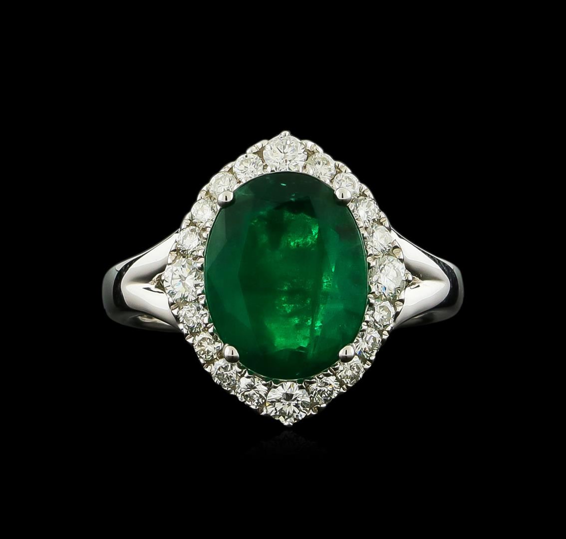 One electronically tested 18KT white gold lady's cast fashion ring with a basket halo with a bright polish finish. The featured lady's ring has a shank measuring 3.78 millimeters wide. Identified with markings of "18K". Condition is new, good workmanship. Containing: One prong set oval modified brilliant cut natural emerald, measuring 12.16 x 9.52 x 4.76mm, 15%. bulge factor, approximate weight of 3.58ct., clarity is moderately included, type III, medium dark, very slightly grayish, green color, (GIA G 6/3), cut is good. Transmitting light somewhat diffusely, transparent to translucent. Naturally occurring internal & external characteristics are present. Indications of oil residue. Graded in the setting. Four prong set round brilliant cut diamonds, measuring 2.50 - 2.40 x 1.52mm (depth est.) approximate total weight of 4 Stones = 0.24ct. Graded in the setting. Clarity: SI-1 to SI-2. Color: Very Good Sixteen prong set round brilliant cut diamonds, measuring 1.90 - 1.80 x 1.15mm (depth est.) approximate total weight of 16 Stones = 0.39ct. Graded in the setting. Clarity: SI-1 to SI-2. Color: G - Good. Total Weight of Colored Stones 3.58ct. Total Weight of Diamonds 0.63ct. Total Weight of Ring 6.80gm GAS Appraised at $7,495.00.