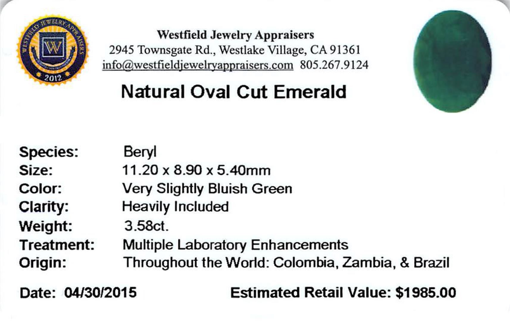 One oval cut natural emerald, measuring 11.20 x 8.90 x 5.40mm, exact weight 3.58ct., clarity is heavily included, type III, medium dark, very slightly grayish, very slightly bluish green color, (GIA vslbG 6/3), cut is good. Westfield Appraised at $1,985.00.