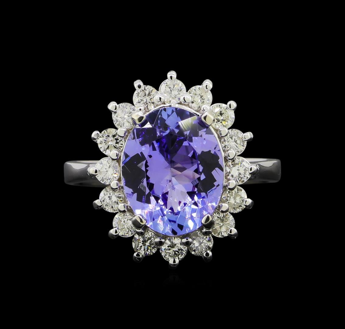 One electronically tested 14KT white gold lady's cast fashion ring with a basket halo with a bright polish finish. The featured lady's ring has a shank measuring 2.44 millimeters wide. Identified with markings of 'K14'. Condition is new, good workmanship. Containing: One prong set oval modified brilliant cut natural tanzanite, measuring 11.27 x 8.96 x 5.13mm, (depth est.) approximate weight of 3.58ct., clarity is eye clean, medium light, moderately strong, bluish violet color, (GIA bV 4/4), cut is good. Transmitting light with no distortion, transparent. Colored gemstones are presumed to have been subjected to commonly used enhancement processes. Graded in the setting. Sixteen prong set round brilliant cut diamonds, measuring 2.40 - 2.30 x 1.41mm (depth est.) approximate total weight of 16 Stones = 0.76ct. Graded in the setting. Clarity SI-1 to SI-2. Color: H - I Cut Good. Total Weight of Colored Stones 3.58ct.. Total Weight of Diamonds 0.76ct.. Total Weight of Ring 5.20gm. GAS Appraised at $7,310.00.