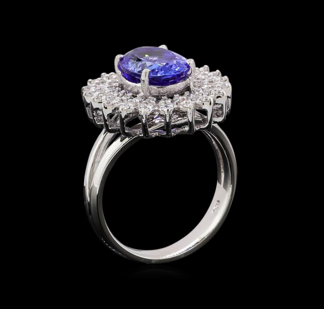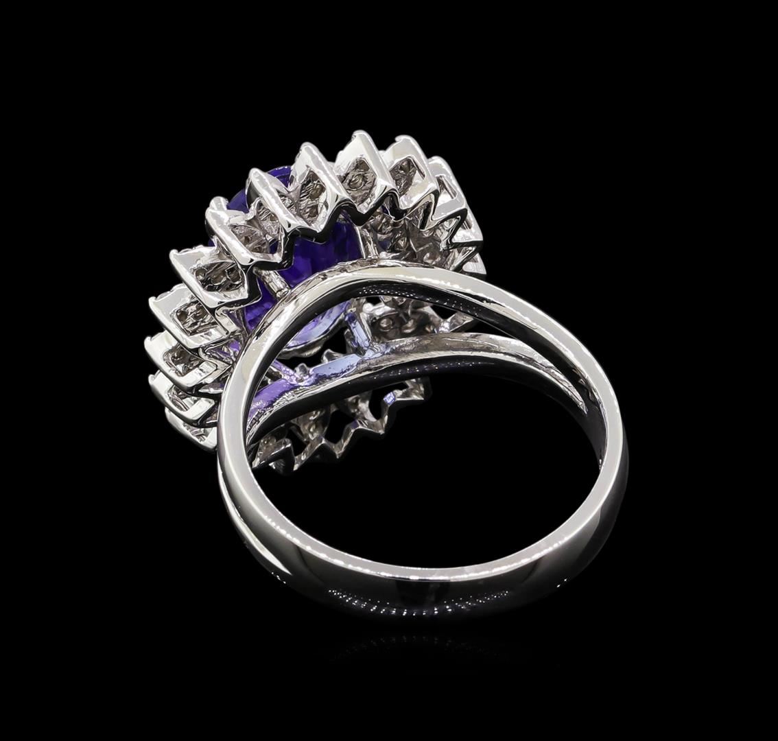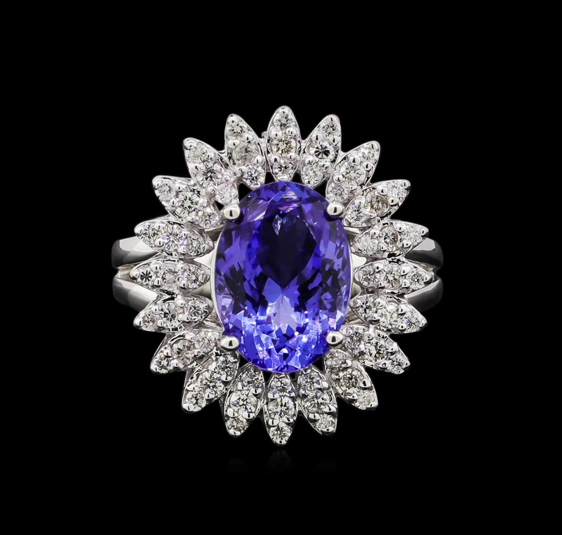 One electronically tested 14KT white gold lady's cast fashion ring with a triple basket halo with a bright polish finish. The featured lady's ring has a shank measuring 3.45 millimeters in width. Identified with markings of 'K14'. Condition is new, good workmanship. Containing: One prong set oval modified brilliant cut natural tanzanite, measuring 11.30 x 8.03 x 5.61mm, (depth est.) approximate weight of 3.58ct., clarity is eye clean, medium, moderately strong, bluish violet color, (GIA bV 5/4), cut is good. Transmitting light with no distortion, transparent. Colored gemstones are presumed to have been subjected to commonly used enhancement processes. Graded in the setting. Twenty prong set round brilliant cut diamonds, measuring 1.65 - 1.60 x 1.01mm (depth est.) approximate total weight of 20 Stones = 0.32ct. Graded in the setting. Clarity SI-1 to I-1. Color: H - I Cut Good Forty prong set round brilliant cut diamonds, measuring 1.35 - 1.30 x 0.80mm (depth est.) approximate total weight of 40 Stones = 0.34ct. Graded in the setting. Clarity SI-1 to SI-2. Color: H - I Cut Good. Total Weight of Colored Stones 3.58ct.. Total Weight of Diamonds 0.66ct.. Total Weight of Ring 7.60gm. GAS Appraised at $8,475.00.