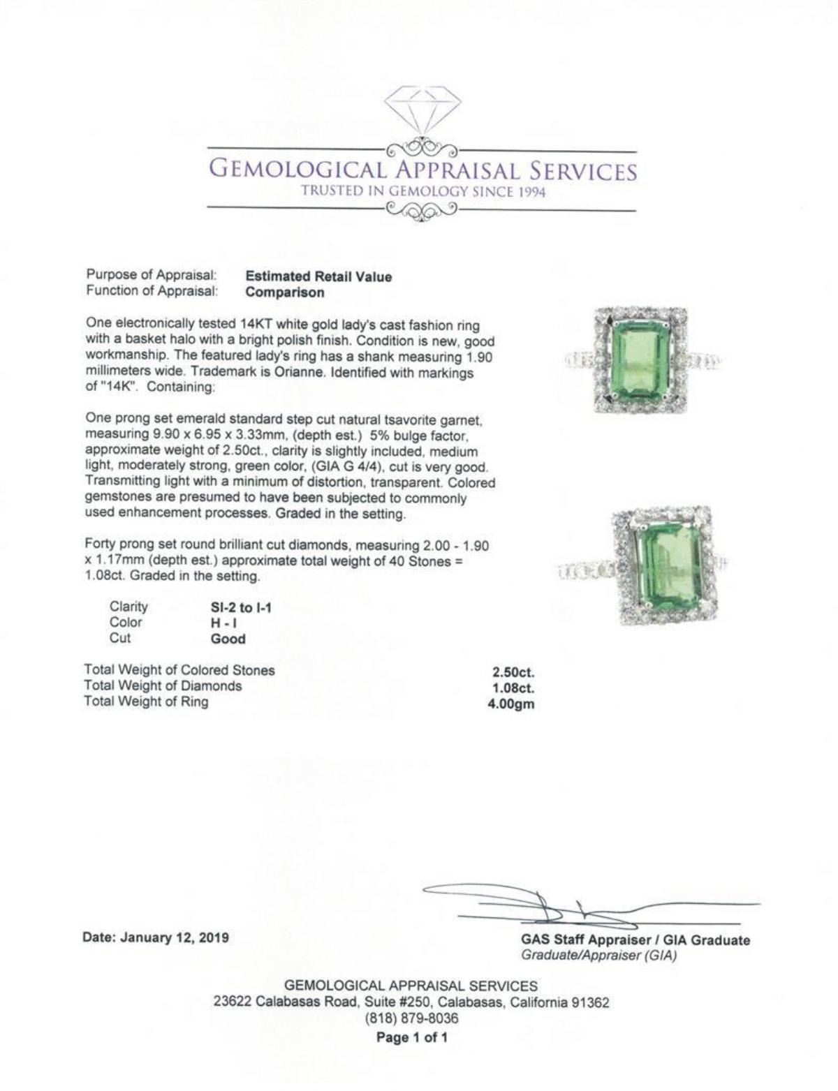 One electronically tested 14KT white gold lady's cast fashion ring with a basket halo with a bright polish finish. The featured lady's ring has a shank measuring 1.90 millimeters wide. Trademark is Orianne. Identified with markings of '14K'. Condition is new, good workmanship. Containing: One prong set emerald standard step cut natural tsavorite garnet, measuring 9.90 x 6.95 x 3.33mm, (depth est.) 5%. bulge factor, approximate weight of 2.50ct., clarity is slightly included, medium light, moderately strong, green color, (GIA G 4/4), cut is very good. Transmitting light with a minimum of distortion, transparent. Colored gemstones are presumed to have been subjected to commonly used enhancement processes. Graded in the setting. Forty prong set round brilliant cut diamonds, measuring 2.00 - 1.90 x 1.17mm (depth est.) approximate total weight of 40 Stones = 1.08ct. Graded in the setting. Color H - I Clarity SI-2 to I-1 Cut Good. Total Weight of Colored Stones 2.50ct.. Total Weight of Diamonds 1.08ct.. Total Weight of Ring 4.00gm GAS Appraised at $7005.00. GAS Appraised.