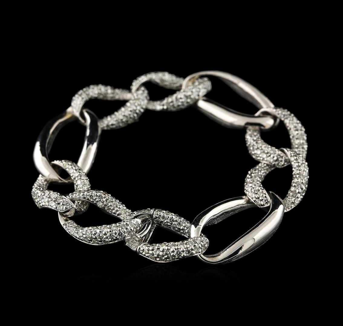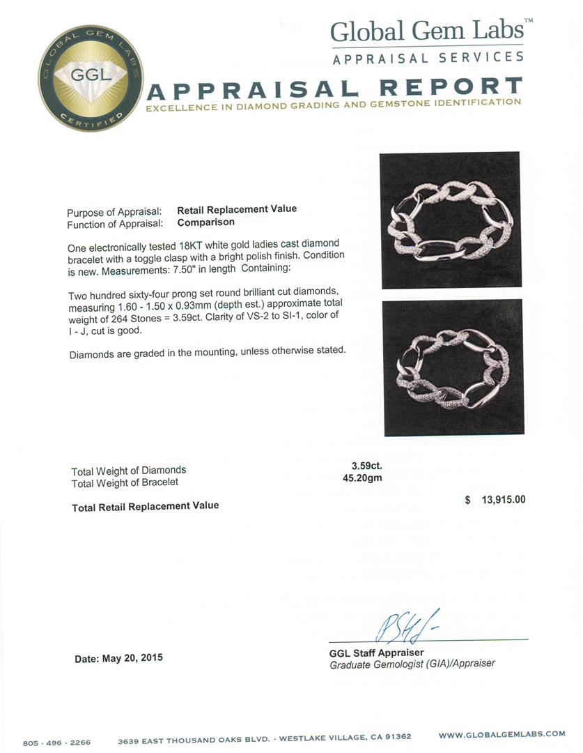 One electronically tested 18KT white gold ladies cast diamond bracelet with a toggle clasp with a bright polish finish. Condition is new. Measurements: 7.50" in length Containing: Two hundred sixty-four prong set round brilliant cut diamonds, measuring 1.60 - 1.50 x 0.93mm (depth est.) approximate total weight of 264 Stones = 3.59ct. Clarity of VS-2 to SI-1, color of 1- J, cut is good. Diamonds are graded in the mounting, unless otherwise stated Total Weight of Diamonds 3.59ct. Total Weight of Bracelet 45.20gm Total Retail Replacement Value $ 13,915.00 GGL Appraised.