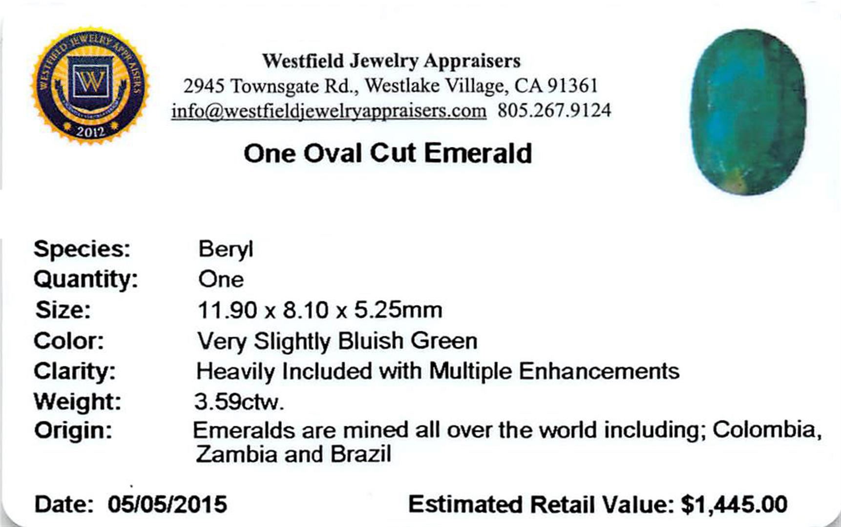 One oval mixed cut natural emerald, measuring 11.90 x 8.10 x 5.25mm, exact weight 3.59ct., clarity is heavily included, type III, medium dark, very slightly bluish green color, (GIA vslbG 6/0) Indications of multiple laboratory enhancements, including high temperature heat treatment. Westfield Appraised at $1,445.00.