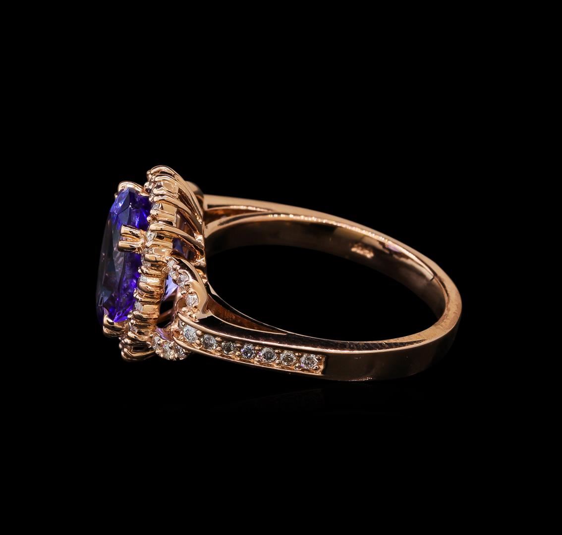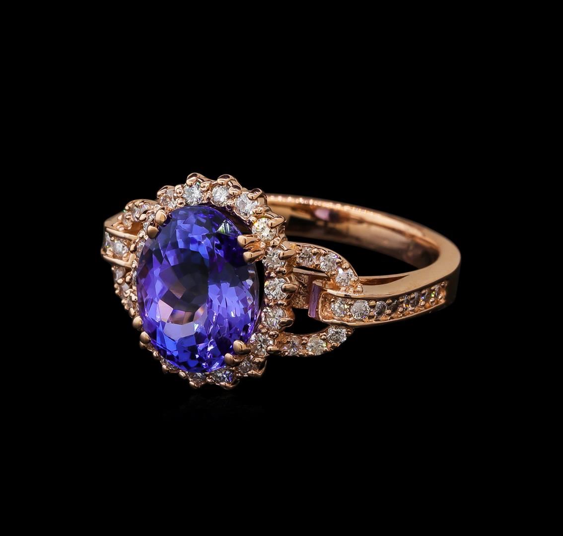 One electronically tested 14KT rose gold lady's cast fashion ring with a basket halo with a bright polish finish. The featured lady's ring has a shank measuring 2.59 millimeters wide. Identified with markings of 'K14'. Condition is new, good workmanship. Containing: One prong set oval modified brilliant cut natural tanzanite, measuring 10.70 x 8.57 x 5.67mm, (depth est.) approximate weight of 3.59ct., clarity is eye clean, medium, moderately strong, bluish violet color, (GIA bV 5/4), cut is good. Transmitting light with no distortion, transparent. Colored gemstones are presumed to have been subjected to commonly used enhancement processes. Graded in the setting. Eighteen prong set round brilliant cut diamonds, measuring 1.60 - 1.50 x 0.95mm (depth est.) approximate total weight of 18 Stones = 0.25ct. Graded in the setting. Clarity SI-1 to SI-2. Color: H - I Cut Good Twenty-Eight prong set round brilliant cut diamonds, measuring 1.40 - 1.30 x 0.81mm (depth est.) approximate total weight of 28 Stones = 0.24ct. Graded in the setting. Clarity SI-1 to I-1. Color: H - I Cut Good. Total Weight of Colored Stones 3.59ct. Total Weight of Diamonds 0.49ct. Total Weight of Ring 5.40gm. GAS Appraised at $7,645.00.
