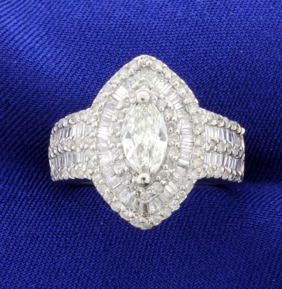 In 14K white gold this ring has a center diamond that is 3/4ct VS clarity/I color. It is surrounded by over 1ct of round and 1.75ct of baguette diamonds also VS color H/I color. All diamonds are well cut with lots of sparkle. Size 9 9.3g