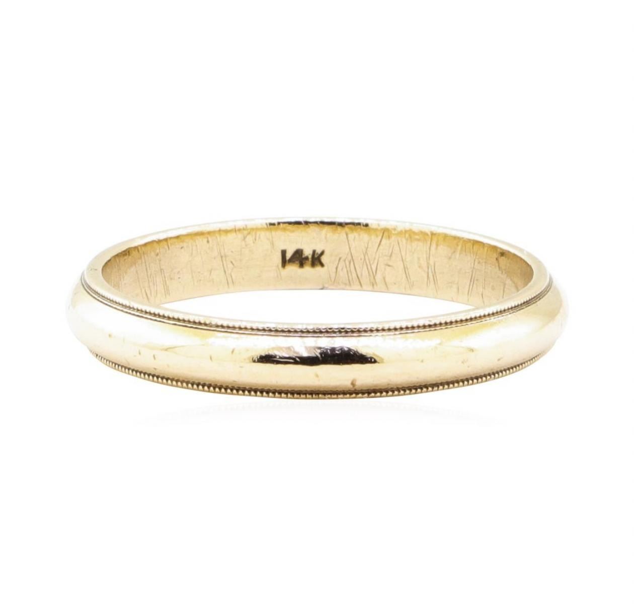 One half dome wedding ring with a milgrain edge featuring: 14KT yellow gold weighing 4.4 grams.