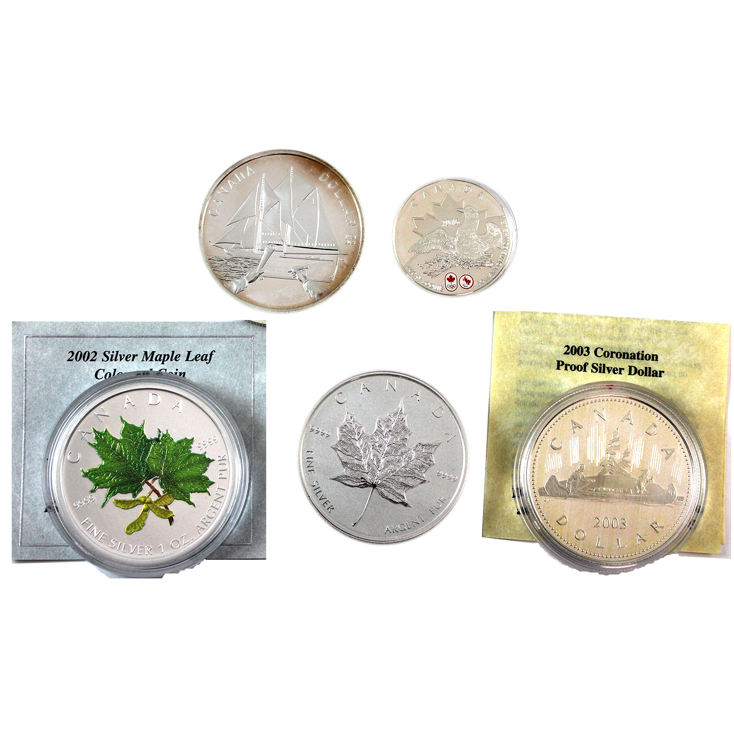 INCLUDES: 2002 Silver Maple Leaf Coloured coin, 2003 Coronation Proof Silver Dollar, 2016 $1 Lucky Loonie - Pure Silver Coin, 2021 (1921-) $1 Bluenose Schooner 100th Anniv Proof Silver Dollar, Pure Silver Maple Leaf Round. 5pcs.