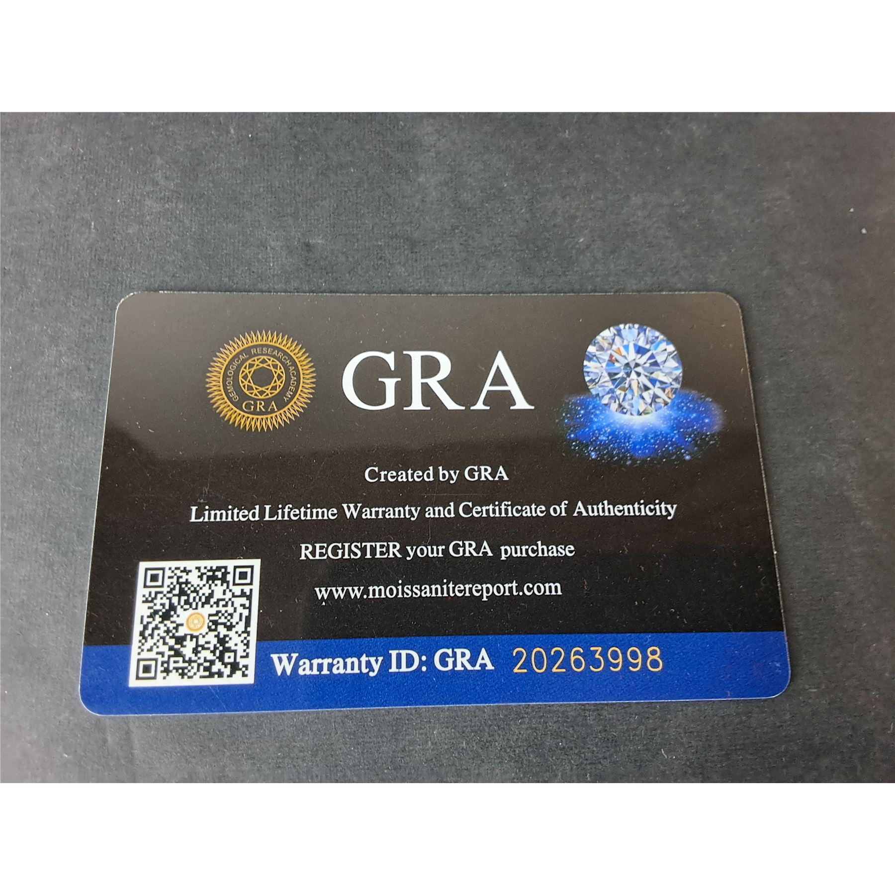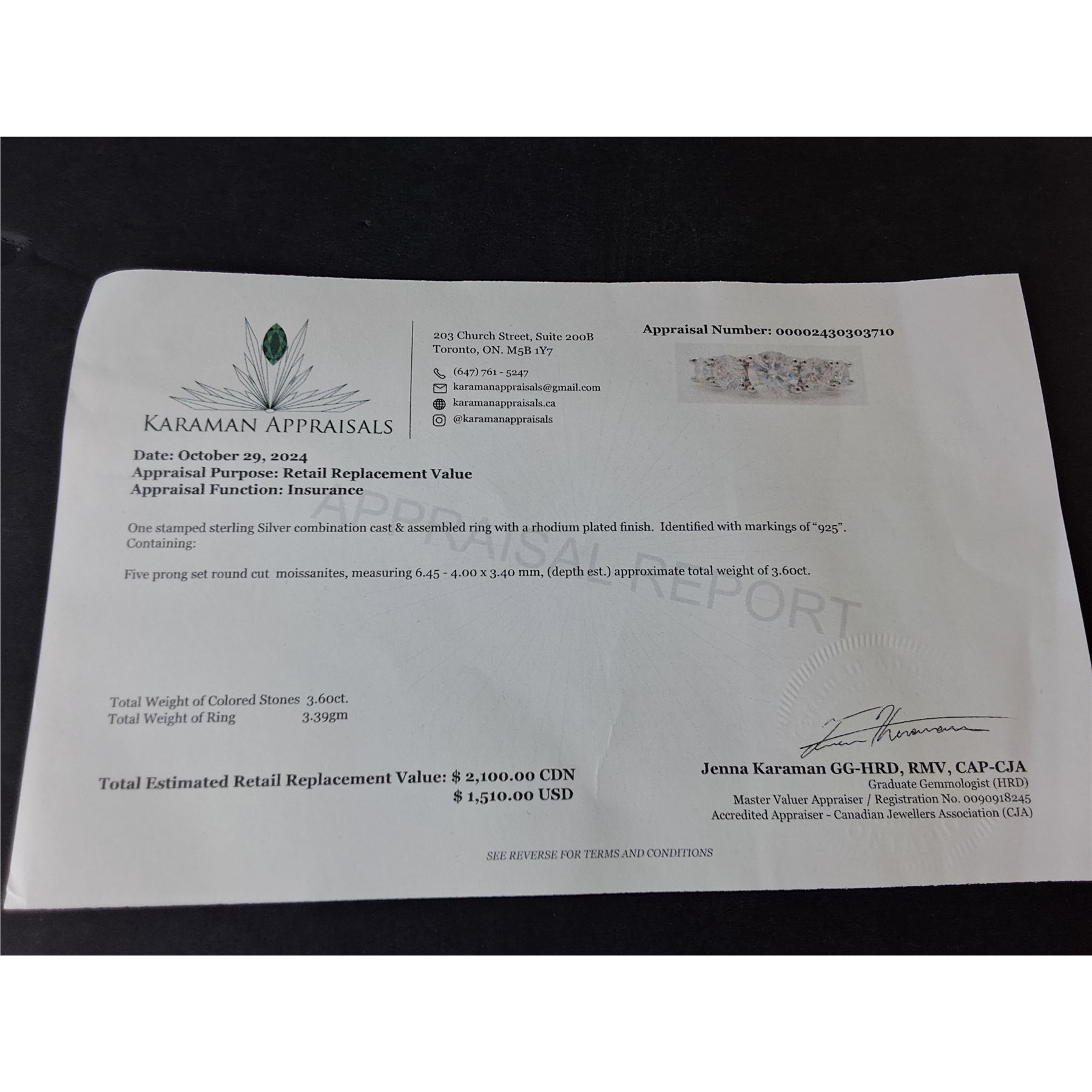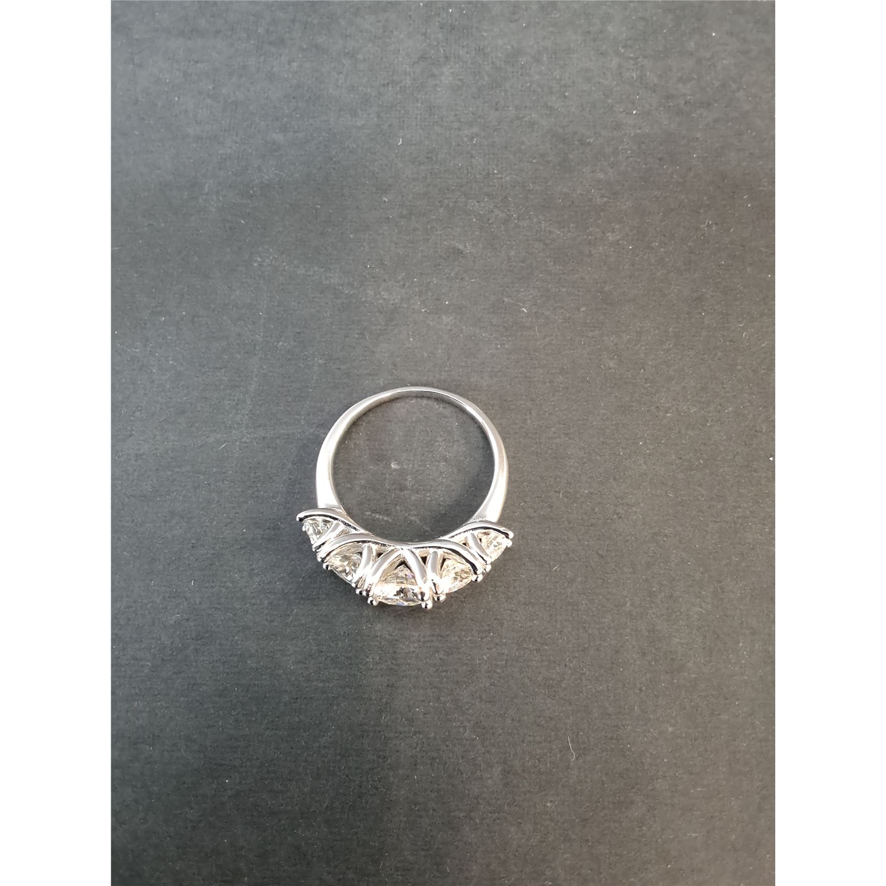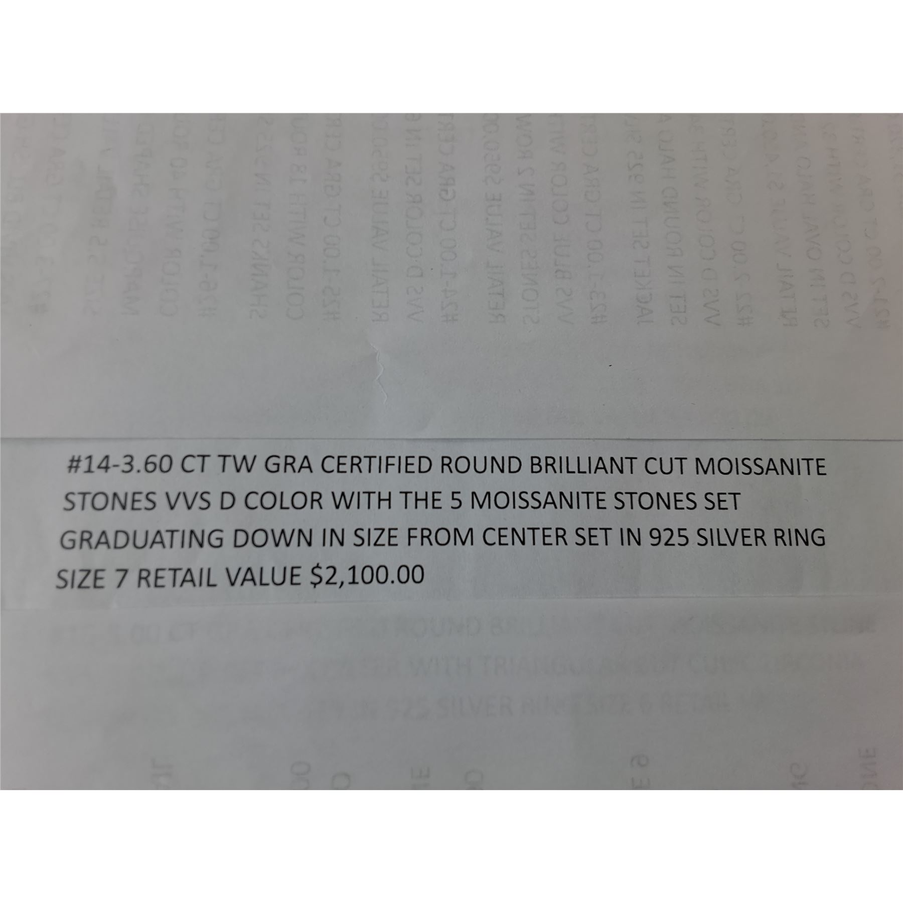 3.60 CT TW GRA CERTIFIED ROUND BRILLIANT CUT MOISSANITE STONES VVS D COLOR WITH THE 5 MOISSANITE STONES SET GRADUATING DOWN IN SIZE FROM CENTER SET IN 925 SILVER RING SIZE 7 RETAIL VALUE $2,100.00