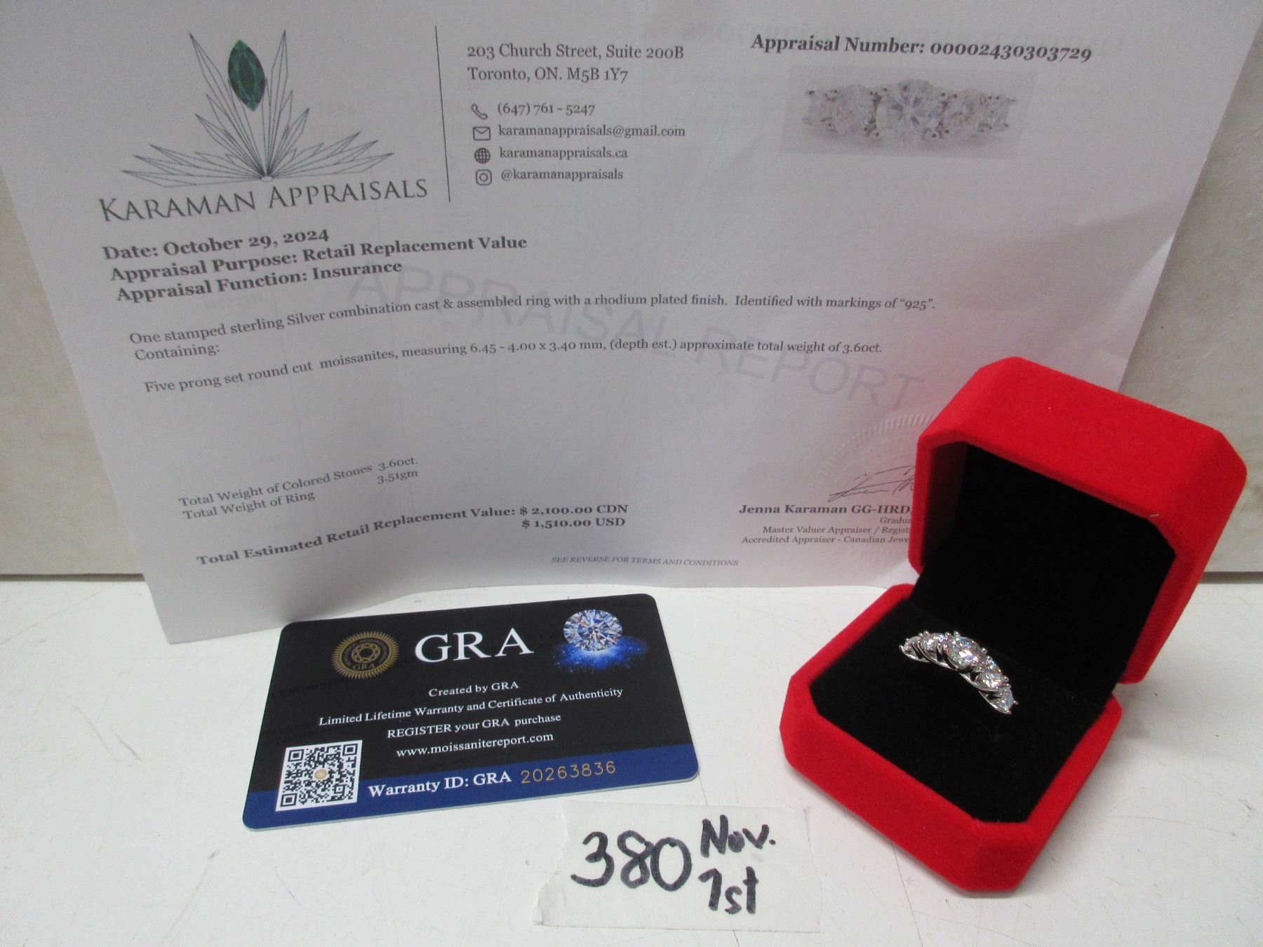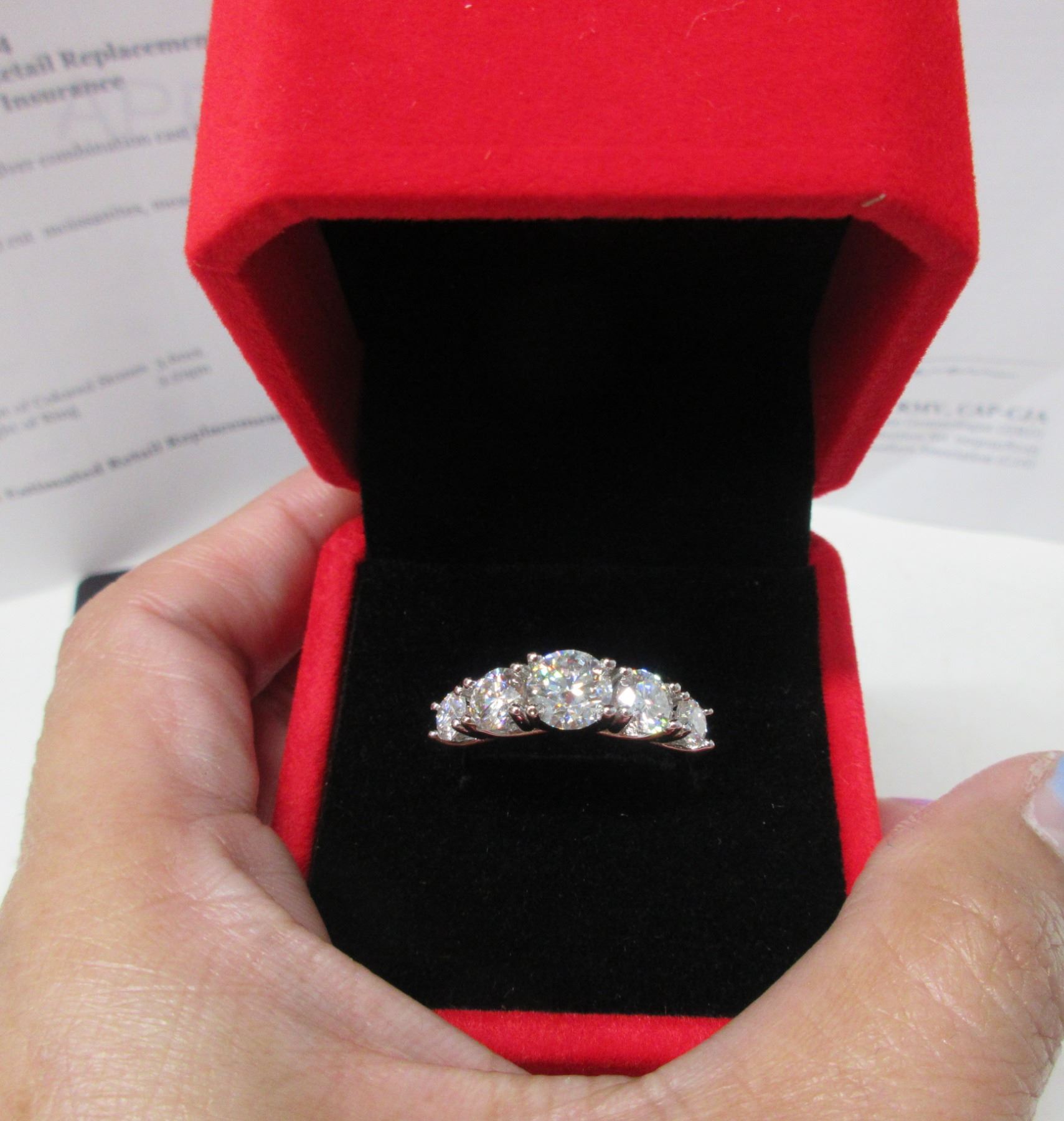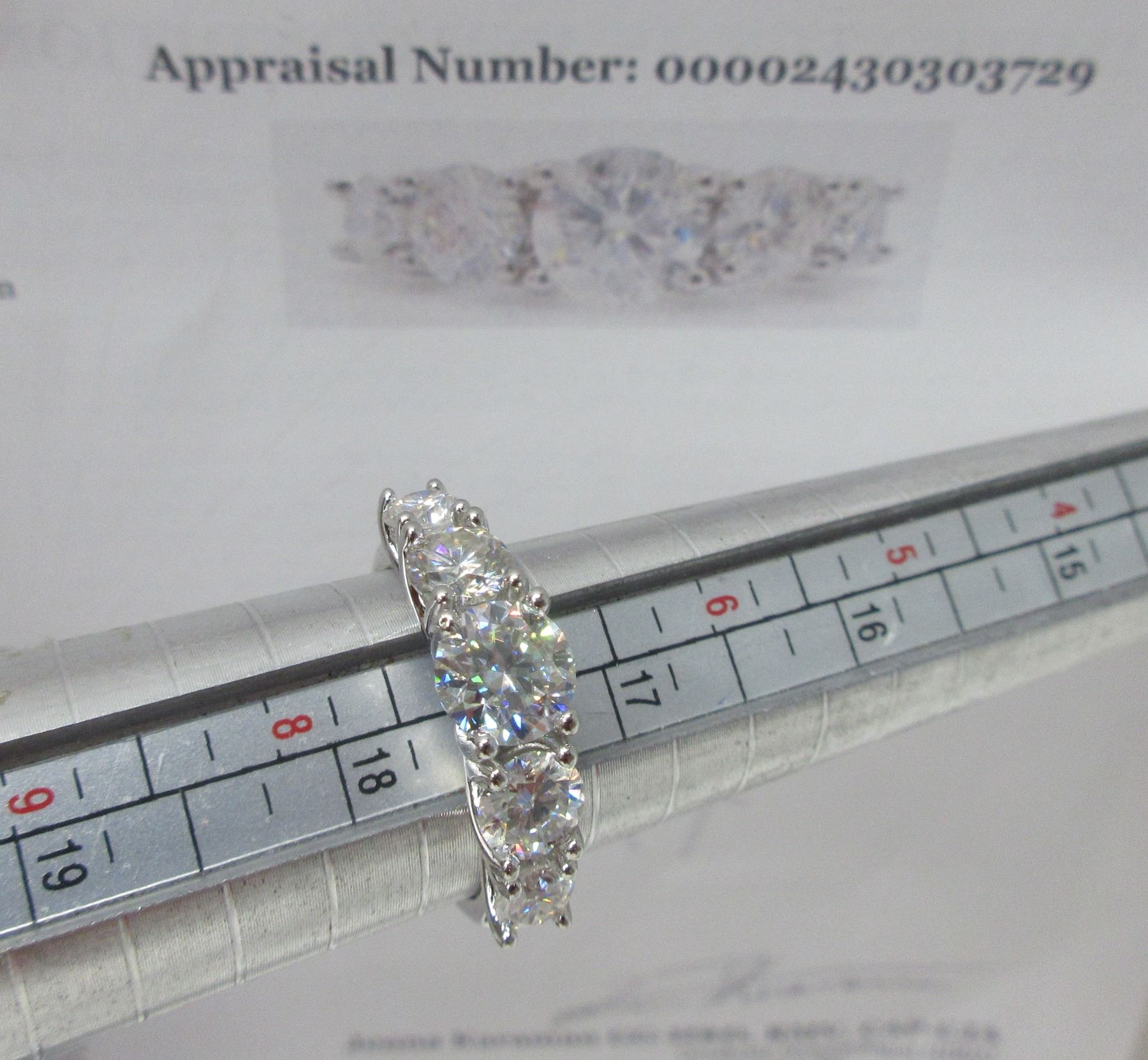 3.60 CT TW GRA CERTIFIED ROUND BRILLIANT CUT MOISSANITE STONE VVS D COLOR WITH THE 5 MOISSANITE STONES SET GRADUATING DOWN IN SIZE FROM CENTER SET IN 925 SILVER RING SIZE RETAIL VALUE $2,100.00
