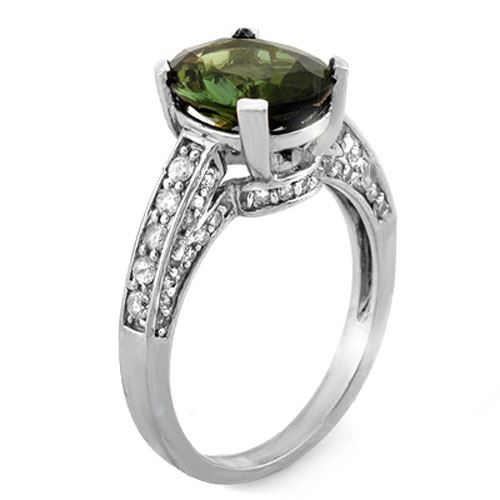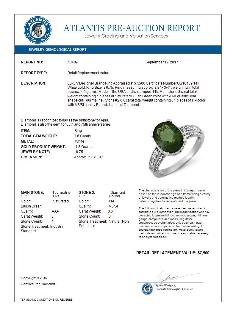 10409 - REF-97X3R ---- 3.60 CTW Green Tourmaline & Diamond Ring 14K White Gold ---- Luxury Designer Brand Ring Appraised at $7,500 Certificate Number US10409 14k White gold, Ring Size is 6.75, Ring measuring approx. 3/8" x 3/4" , weighing in total approx. 4.2 grams. Made in the USA and is stamped 14k, Main stone 3 carat total weight containing 1 pieces of Saturated Bluish Green color with AAA quality Oval shape cut Tourmaline , Stone #2 0.6 carat total weight containing 64 pieces of H-I color with VS/SI quality Round shape cut Diamond