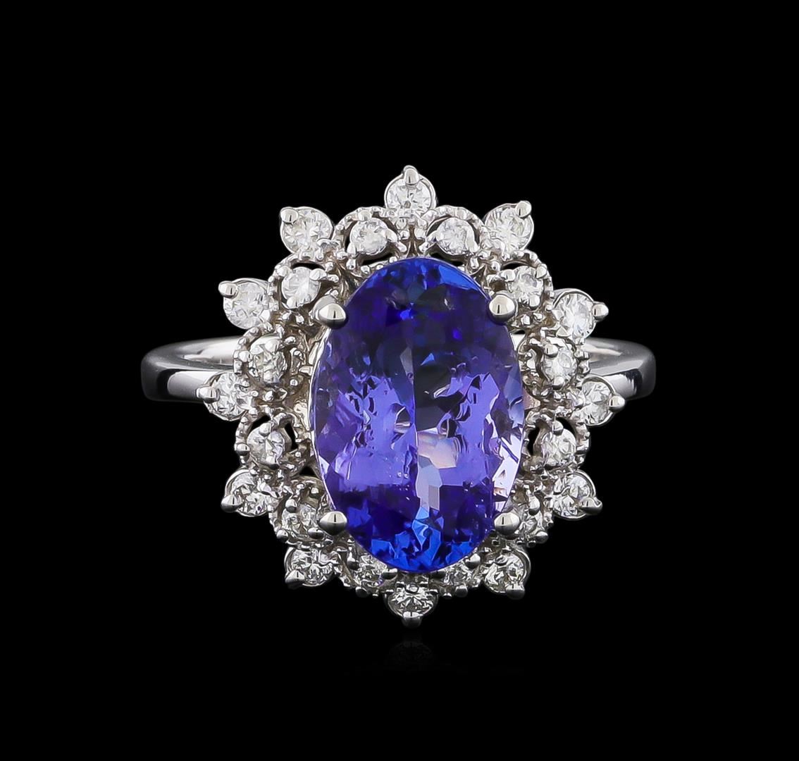 One electronically tested 14KT white gold lady's cast fashion ring with a double basket halo with a bright polish with milgrain detailing finish. The featured lady's ring has a shank measuring 2.48 millimeters wide. Identified with markings of "K14". Condition is new, good workmanship. Containing: One prong set oval modified brilliant cut natural tanzanite, measuring 12.09 x 8.04 x 5.29mm, approximate weight of 3.60ct., clarity is eye clean, type I, medium, very slightly grayish, violetish blue color, (GIA vB 5/3), cut is very good. Transmitting light with no distortion, transparent. Colored gemstones are presumed to have been subjected to commonly used enhancement processes. Graded in the setting. Twelve prong set round brilliant cut diamonds, measuring 1.85 - 1.75 x 1.10mm (depth est.) approximate total weight of 12 Stones = 0.26ct. Graded in the setting. Clarity: SI-1 to SI-2. Color: H - I. Cut Good Twelve prong set round brilliant cut diamonds, measuring 1.50 - 1.45 x 0.92mm (depth est.) approximate total weight of 12 Stones = 0.15ct. Graded in the setting. Clarity: SI-2 to I-1. Color: H - I. Cut Good. Total Weight of Colored Stones 3.60ct. Total Weight of Diamonds 0.41ct. Total Weight of Ring 4.60gm. GAS Appraised at $7,265.00.