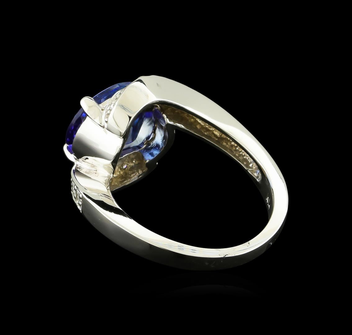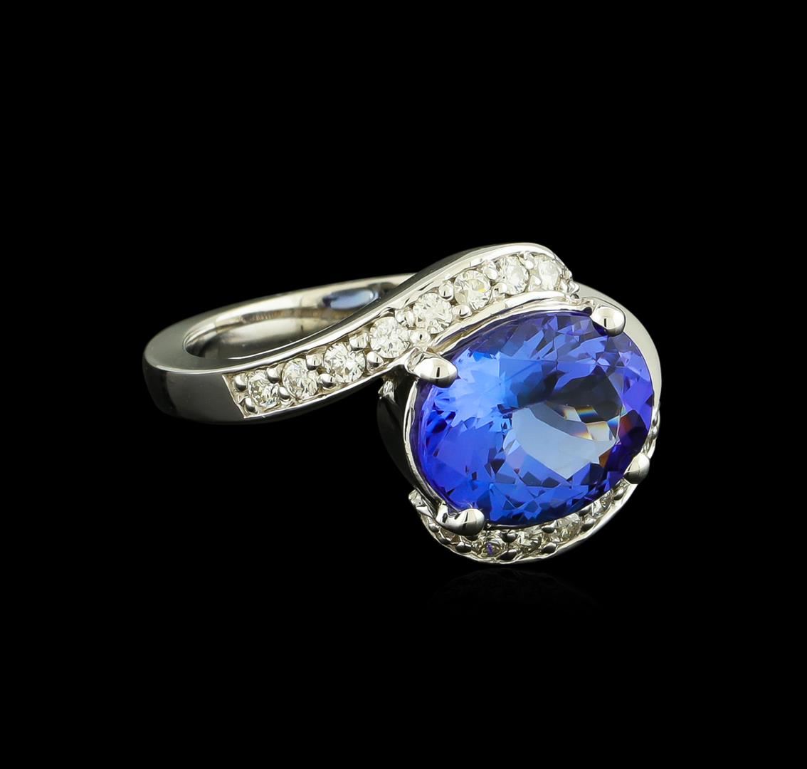 One electronically tested 14KT white gold lady's cast fashion ring with a bypass shank with a bright polish finish. The featured lady's ring has a shank measuring 2.37 millimeters wide. Identified with markings of "K14". Condition is new, good workmanship. Containing: One prong set oval modified brilliant cut natural tanzanite, measuring 11.20 x 9.15 x 5.22mm, approximate weight of 3.60ct., clarity is eye clean, type I, medium, very slightly grayish, violetish blue color, (GIA vB 5/3), cut is very good. Transmitting light with no distortion, transparent. Colored gemstones are presumed to have been subjected to commonly used enhancement processes. Graded in the setting. Sixteen prong set round brilliant cut diamonds, measuring 1.80 - 1.70 x 1.09mm (depth est.) approximate total weight of 16 Stones = 0.32ct. Graded in the setting. Clarity: SI-1 to I-1. Color: H - I. Cut Good. Total Weight of Colored Stones 3.60ct. Total Weight of Diamonds 0.32ct. Total Weight of Ring 6.40gm. GAS Appraised at $7,335.00.