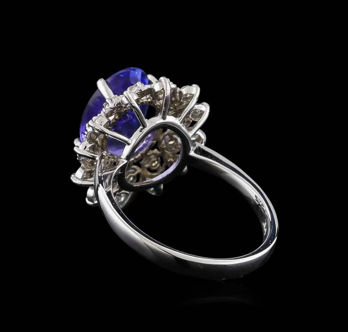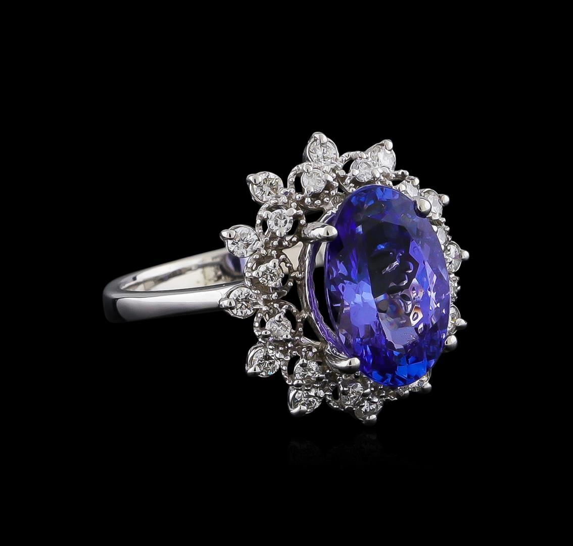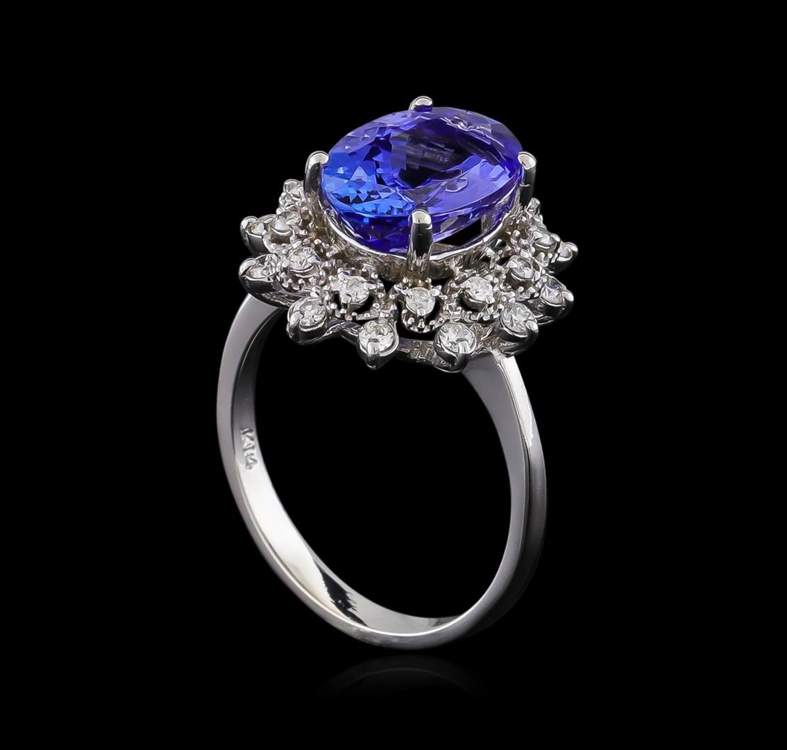 One electronically tested 14KT white gold lady's cast fashion ring with a double basket halo with a bright polish with milgrain detailing finish. The featured lady's ring has a shank measuring 2.48 millimeters wide. Identified with markings of "K14". Condition is new, good workmanship. Containing: One prong set oval modified brilliant cut natural tanzanite, measuring 12.09 x 8.04 x 5.29mm, approximate weight of 3.60ct., clarity is eye clean, type I, medium, very slightly grayish, violetish blue color, (GIA vB 5/3), cut is very good. Transmitting light with no distortion, transparent. Colored gemstones are presumed to have been subjected to commonly used enhancement processes. Graded in the setting. Twelve prong set round brilliant cut diamonds, measuring 1.85 - 1.75 x 1.10mm (depth est.) approximate total weight of 12 Stones = 0.26ct. Graded in the setting. Clarity: SI-1 to SI-2. Color: H - I. Cut Good Twelve prong set round brilliant cut diamonds, measuring 1.50 - 1.45 x 0.92mm (depth est.) approximate total weight of 12 Stones = 0.15ct. Graded in the setting. Clarity: SI-2 to I-1. Color: H - I. Cut Good. Total Weight of Colored Stones 3.60ct. Total Weight of Diamonds 0.41ct. Total Weight of Ring 4.60gm. GAS Appraised at $7,265.00.