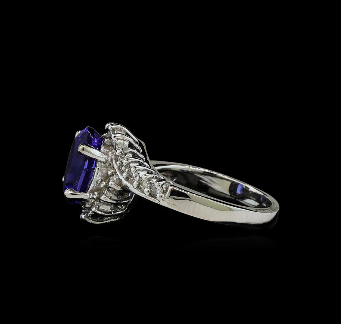 One electronically tested 14KT white gold lady's cast fashion ring with a bypass swirl halo with a bright polish finish. The featured lady's ring has a shank measuring 2.97 millimeters wide. Identified with markings of '14K'. Condition is new, good workmanship. Containing: One prong set oval modified brilliant cut natural tanzanite, measuring 10.52 x 8.19 x 6.05mm, (depth est.) approximate weight of 3.60ct., clarity is eye clean, medium dark, strong, violetish blue color, (GIA vB 6/5), cut is very good. Transmitting light with no distortion, transparent. Colored gemstones are presumed to have been subjected to commonly used enhancement processes. Graded in the setting. Twenty-Two prong set round brilliant cut diamonds, measuring 1.80 - 1.70 x 1.09mm (depth est.) approximate total weight of 22 Stones = 0.45ct. Graded in the setting. Clarity SI-1 to I-1. Color: G - H Cut Good. Total Weight of Colored Stones 3.60ct.. Total Weight of Diamonds 0.45ct.. Total Weight of Ring 7.00gm GAS Appraised at $8,415.00.