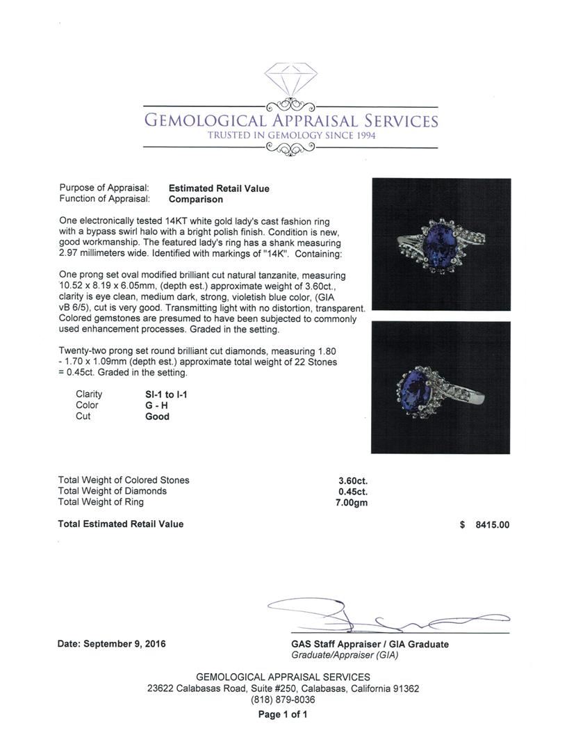 One electronically tested 14KT white gold lady's cast fashion ring with a bypass swirl halo with a bright polish finish. The featured lady's ring has a shank measuring 2.97 millimeters wide. Identified with markings of '14K'. Condition is new, good workmanship. Containing: One prong set oval modified brilliant cut natural tanzanite, measuring 10.52 x 8.19 x 6.05mm, (depth est.) approximate weight of 3.60ct., clarity is eye clean, medium dark, strong, violetish blue color, (GIA vB 6/5), cut is very good. Transmitting light with no distortion, transparent. Colored gemstones are presumed to have been subjected to commonly used enhancement processes. Graded in the setting. Twenty-Two prong set round brilliant cut diamonds, measuring 1.80 - 1.70 x 1.09mm (depth est.) approximate total weight of 22 Stones = 0.45ct. Graded in the setting. Clarity SI-1 to I-1. Color: G - H Cut Good. Total Weight of Colored Stones 3.60ct.. Total Weight of Diamonds 0.45ct.. Total Weight of Ring 7.00gm GAS Appraised at $8,415.00.