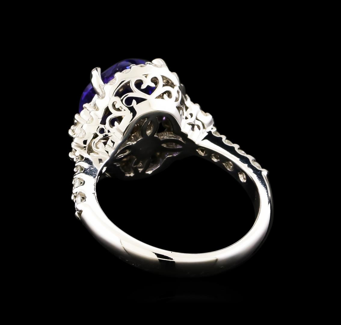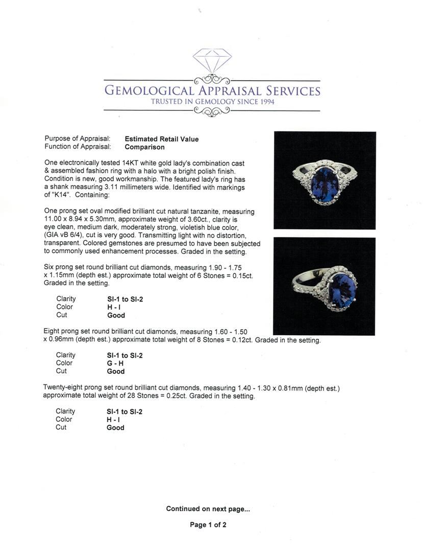 One electronically tested 14KT white gold lady's combination cast & assembled fashion ring with a halo with a bright polish finish. The featured lady's ring has a shank measuring 3.11 millimeters wide. Identified with markings of "K14". Condition is new, good workmanship. Containing: One prong set oval modified brilliant cut natural tanzanite, measuring 11.00 x 8.94 x 5.30mm, approximate weight of 3.60ct., clarity is eye clean, medium dark, moderately strong, violetish blue color, (GIA vB 6/4), cut is very good. Transmitting light with no distortion, transparent. Colored gemstones are presumed to have been subjected to commonly used enhancement processes. Graded in the setting. Six prong set round brilliant cut diamonds, measuring 1.90 - 1.75 x 1.15mm (depth est.) approximate total weight of 6 Stones = 0.15ct. Graded in the setting. Clarity: SI-1 to SI-2. Color: H - I. Cut Good Eight prong set round brilliant cut diamonds, measuring 1.60 - 1.50 x 0.96mm (depth est.) approximate total weight of 8 Stones = 0.12ct. Graded in the setting. Clarity: SI-1 to SI-2. Color: G - Good Twenty-Eight prong set round brilliant cut diamonds, measuring 1.40 - 1.30 x 0.81mm (depth est.) approximate total weight of 28 Stones = 0.25ct. Graded in the setting. Clarity: SI-1 to SI-2. Color: H - I. Cut Good. Total Weight of Colored Stones 3.60ct. Total Weight of Diamonds 0.52ct. Total Weight of Ring 6.20gm. GAS Appraised at $8,625.00.