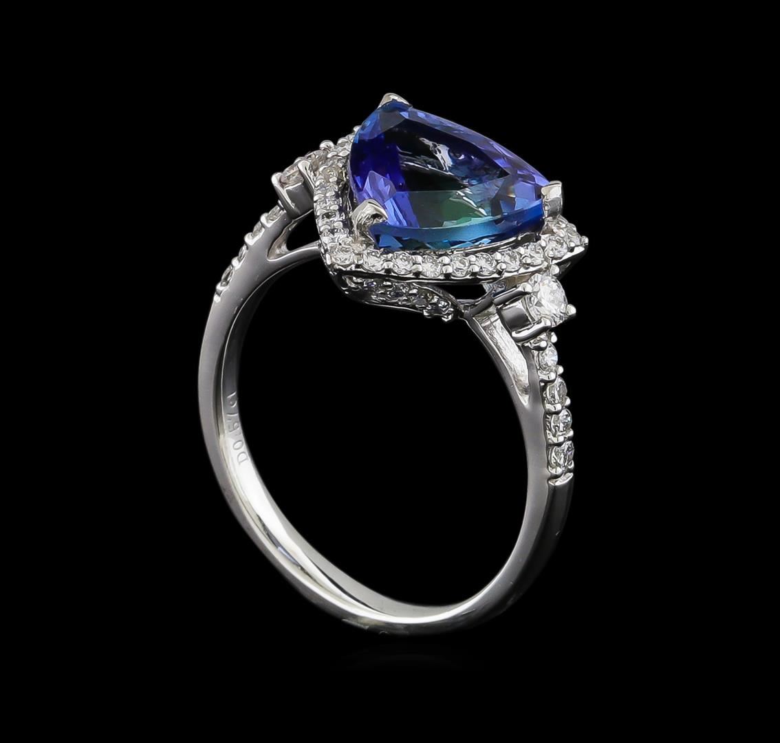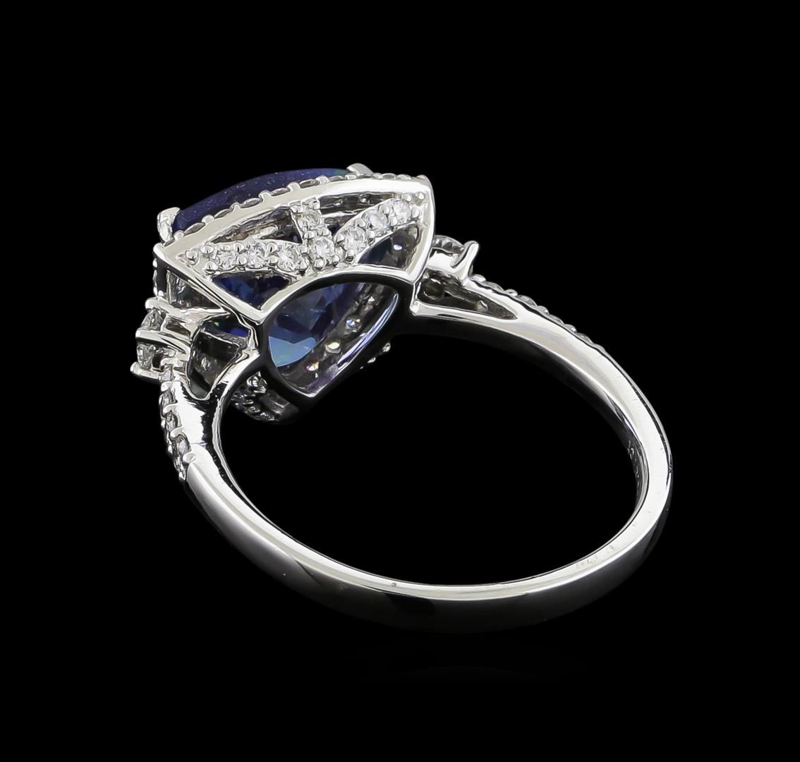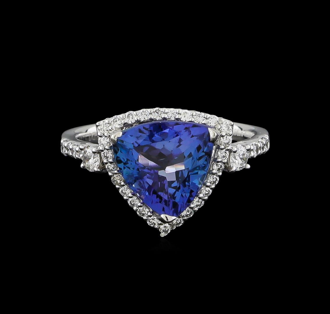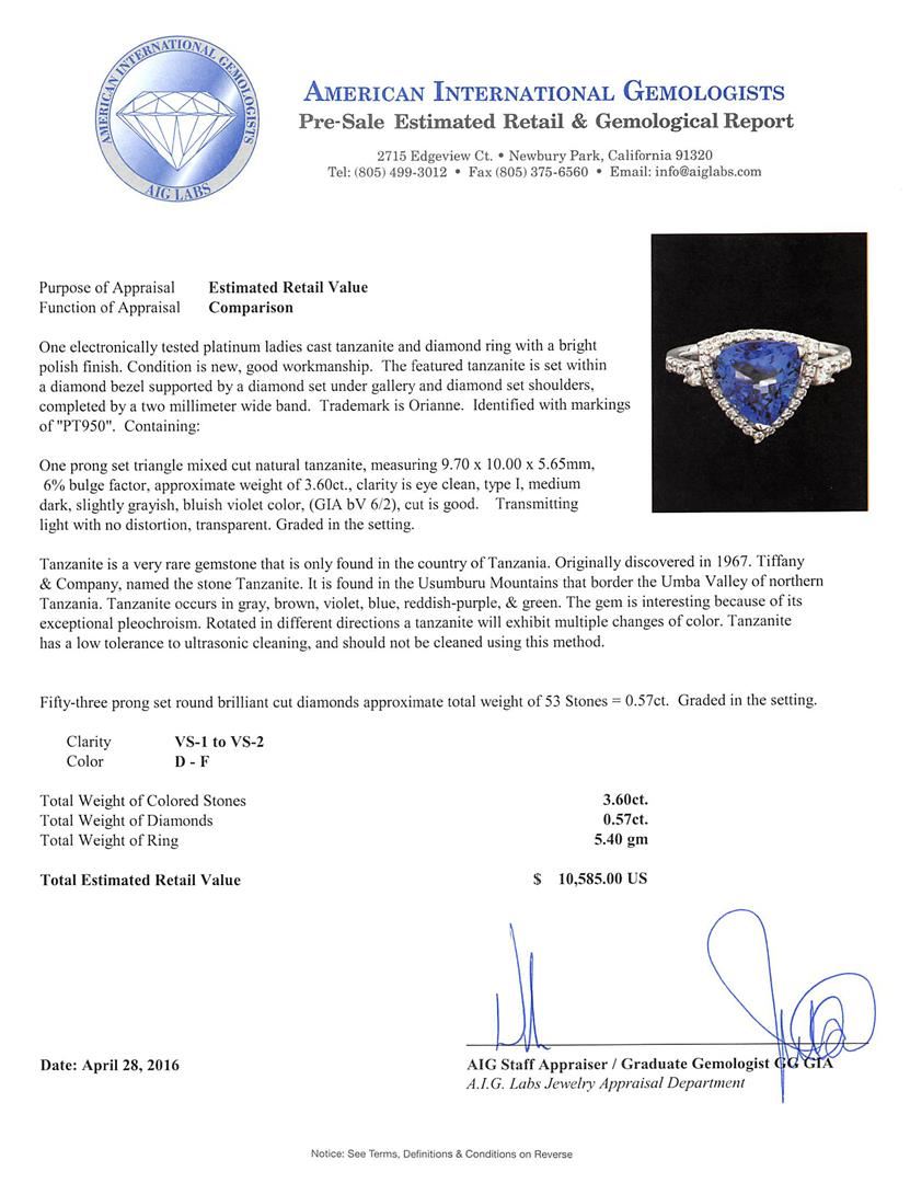One electronically tested platinum ladies cast tanzanite and diamond ring with a bright polish finish. The featured tanzanite is set within a diamond bezel supported by a diamond set under gallery and diamond set shoulders, completed by a two millimeter wide band. Trademark is Orianne. Identified with markings of "PT950". Condition is new, good workmanship. Containing: One prong set triangle mixed cut natural tanzanite, measuring 9.70 x 10.00 x 5.65mm, 6%. bulge factor, approximate weight of 3.60ct., clarity is eye clean, type I, medium dark, slightly grayish, bluish violet color, (GIA bV 6/2), cut is good. Transmitting light with no distortion, transparent. Graded in the setting. Tanzanite is a very rare gemstone that is only found in the country of Tanzania. Originally discovered in 1967. Tiffany & Company, named the stone Tanzanite. It is found in the Usumburu Mountains that border the Umba Valley of northern Tanzania. Tanzanite occurs in gray, brown, violet, blue, reddish-purple, & green. The gem is interesting because of its exceptional pleochroism. Rotated in different directions a tanzanite will exhibit multiple changes of color. Tanzanite has a low tolerance to ultrasonic cleaning, and should not be cleaned using this method. Fifty-Three prong set round brilliant cut diamonds approximate total weight of 53 Stones = 0.57ct. Graded in the setting. Clarity: VS-1 to VS-2. Color: D - F. Total Weight of Colored Stones 3.60ct. Total Weight of Diamonds 0.57ct. Total Weight of Ring 5.40gm. AIG Appraised at $10,585.00.