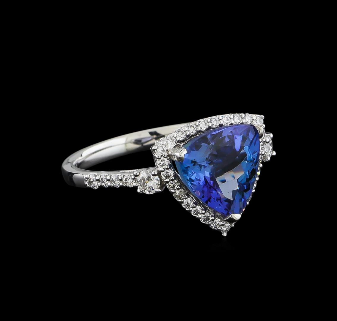 One electronically tested platinum ladies cast tanzanite and diamond ring with a bright polish finish. The featured tanzanite is set within a diamond bezel supported by a diamond set under gallery and diamond set shoulders, completed by a two millimeter wide band. Trademark is Orianne. Identified with markings of "PT950". Condition is new, good workmanship. Containing: One prong set triangle mixed cut natural tanzanite, measuring 9.70 x 10.00 x 5.65mm, 6%. bulge factor, approximate weight of 3.60ct., clarity is eye clean, type I, medium dark, slightly grayish, bluish violet color, (GIA bV 6/2), cut is good. Transmitting light with no distortion, transparent. Graded in the setting. Tanzanite is a very rare gemstone that is only found in the country of Tanzania. Originally discovered in 1967. Tiffany & Company, named the stone Tanzanite. It is found in the Usumburu Mountains that border the Umba Valley of northern Tanzania. Tanzanite occurs in gray, brown, violet, blue, reddish-purple, & green. The gem is interesting because of its exceptional pleochroism. Rotated in different directions a tanzanite will exhibit multiple changes of color. Tanzanite has a low tolerance to ultrasonic cleaning, and should not be cleaned using this method. Fifty-Three prong set round brilliant cut diamonds approximate total weight of 53 Stones = 0.57ct. Graded in the setting. Clarity: VS-1 to VS-2. Color: D - F. Total Weight of Colored Stones 3.60ct. Total Weight of Diamonds 0.57ct. Total Weight of Ring 5.40gm. AIG Appraised at $10,585.00.