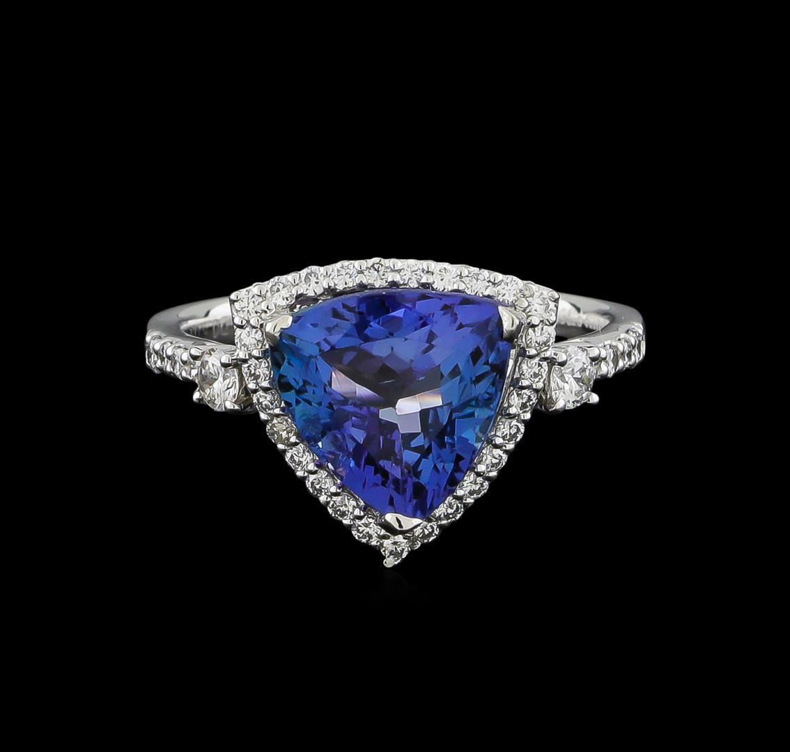 One electronically tested platinum ladies cast tanzanite and diamond ring with a bright polish finish. The featured tanzanite is set within a diamond bezel supported by a diamond set under gallery and diamond set shoulders, completed by a two millimeter wide band. Trademark is Orianne. Identified with markings of "PT950". Condition is new, good workmanship. Containing: One prong set triangle mixed cut natural tanzanite, measuring 9.70 x 10.00 x 5.65mm, 6%. bulge factor, approximate weight of 3.60ct., clarity is eye clean, type I, medium dark, slightly grayish, bluish violet color, (GIA bV 6/2), cut is good. Transmitting light with no distortion, transparent. Graded in the setting. Tanzanite is a very rare gemstone that is only found in the country of Tanzania. Originally discovered in 1967. Tiffany & Company, named the stone Tanzanite. It is found in the Usumburu Mountains that border the Umba Valley of northern Tanzania. Tanzanite occurs in gray, brown, violet, blue, reddish-purple, & green. The gem is interesting because of its exceptional pleochroism. Rotated in different directions a tanzanite will exhibit multiple changes of color. Tanzanite has a low tolerance to ultrasonic cleaning, and should not be cleaned using this method. Fifty-Three prong set round brilliant cut diamonds approximate total weight of 53 Stones = 0.57ct. Graded in the setting. Clarity: VS-1 to VS-2. Color: D - F. Total Weight of Colored Stones 3.60ct. Total Weight of Diamonds 0.57ct. Total Weight of Ring 5.40gm.