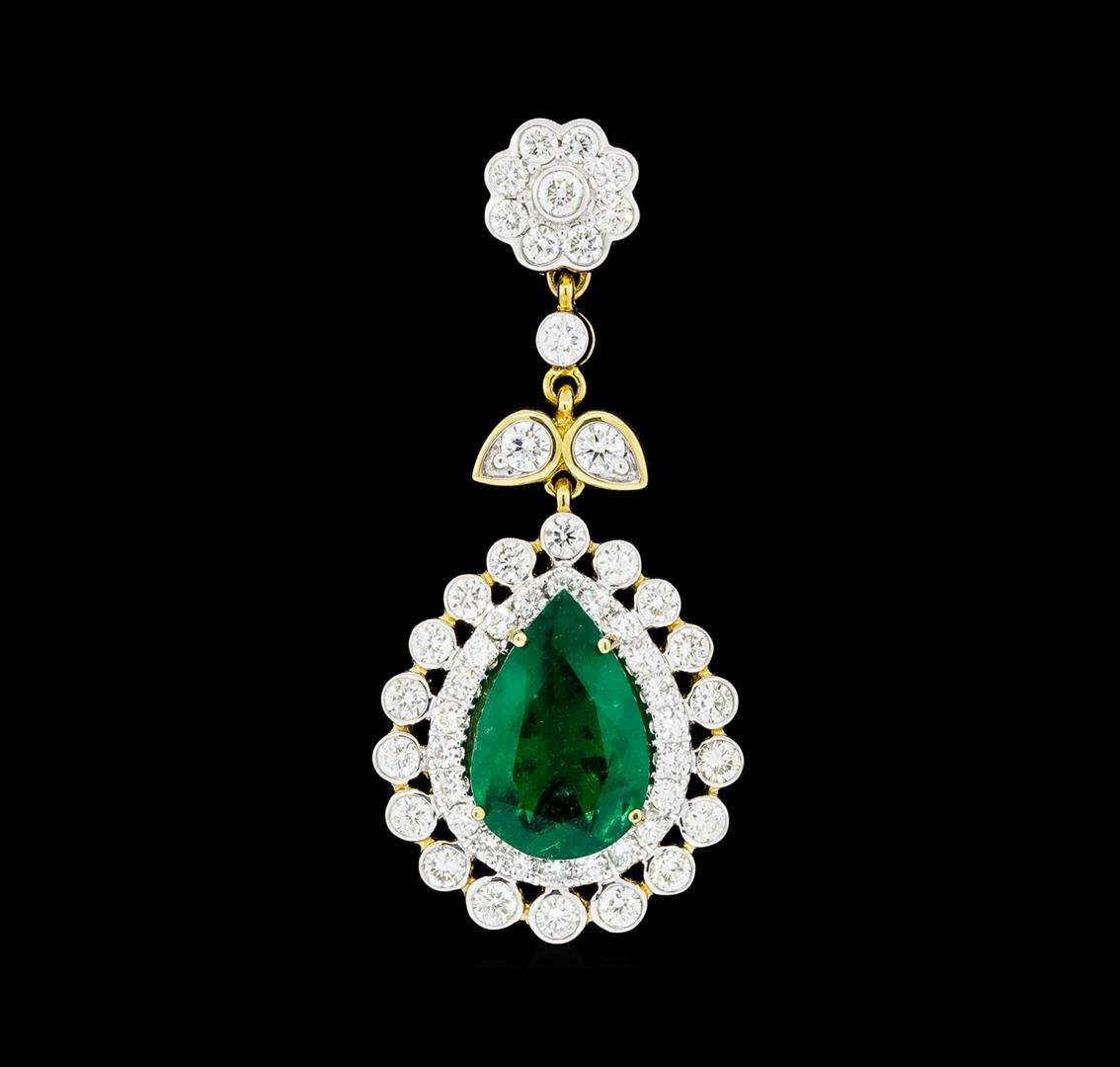 One electronically tested 18KT yellow with rhodium plating gold lady's combination cast & assembled fashion pendant with a bright polish finish. Identified with markings of '18K'. Condition is new, good workmanship. Containing: One prong set pear modified brilliant cut natural emerald, measuring 14.25 x 9.36 x 4.95mm, (depth est.) approximate weight of 3.61ct., clarity is heavily included, medium, strong, green color, (GIA G 5/5), cut is very good. The featured emerald is Columbian in origin. Transmitting light somewhat diffusely, semi-transparent to translucent. Naturally occurring internal & external characteristics are present. Indications of oil residue. Colored gemstones are presumed to have been subjected to commonly used enhancement processes. Graded in the setting. Four bezel set round brilliant cut diamonds, measuring 2.70 - 2.60 x 1.64mm (depth est.) approximate total weight of 4 Stones = 0.28ct. Graded in the setting. Color G - H Clarity VS-1 to VS-2 Cut Very Good Twenty-Six bezel set round brilliant cut diamonds, measuring 2.30 - 2.10 x 1.32mm (depth est.) approximate total weight of 26 Stones = 0.95ct. Graded in the setting. Color G - H Clarity VS-2 to SI-1 Cut Very Good Twenty-Two prong set round brilliant cut diamonds, measuring 1.90 - 1.80 x 1.15mm (depth est.) approximate total weight of 22 Stones = 0.53ct. Graded in the setting. Color G - I Clarity VS-2 to SI-1 Cut Very Good. Total Weight of Colored Stones 3.61ct.. Total Weight of Diamonds 1.76ct.. Total Weight of Pendant 8.50gm GAS Appraised at $51115.00. GAS Appraised at $51,115.00.