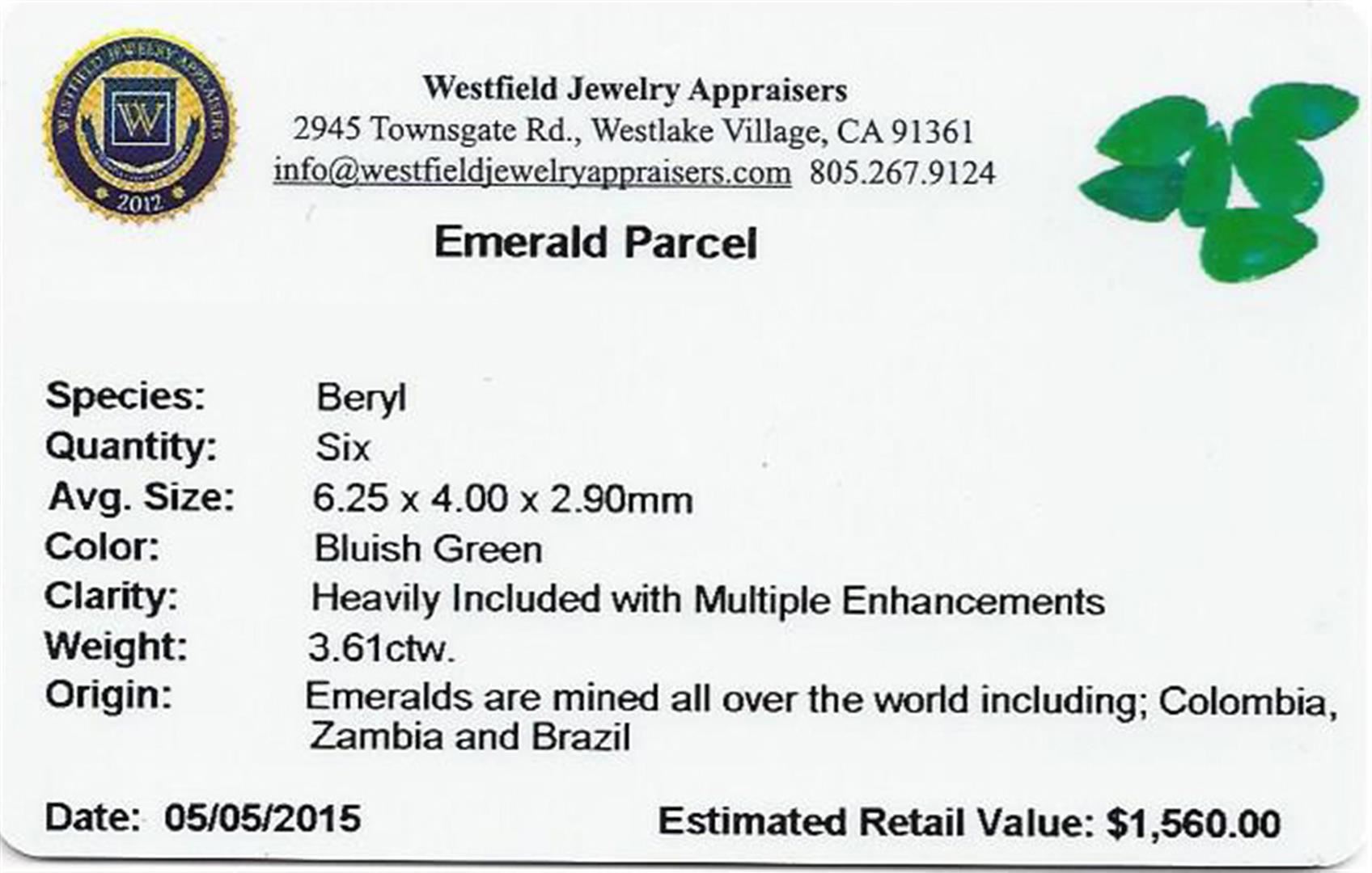 Five pear mixed cut natural emeralds, measuring 6.25 x 4.00 x 2.90mm, approximate total weight of 3.61ct., clarity is heavily included, type III, medium dark, very slightly grayish, bluish green color, (GIA bG 6/3), cut is good. Indications of multiple laboratory enhancements, including high temperature heat treatment. Westfield Appraised at $1,560.00.